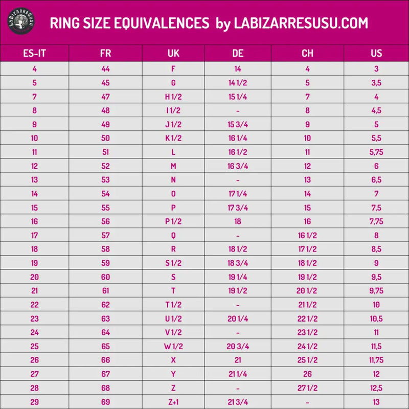 • Medidas: Talla 20 España (diámetro interior 19,6 mm), consultar la tabla de equivalencias por talla y pais.