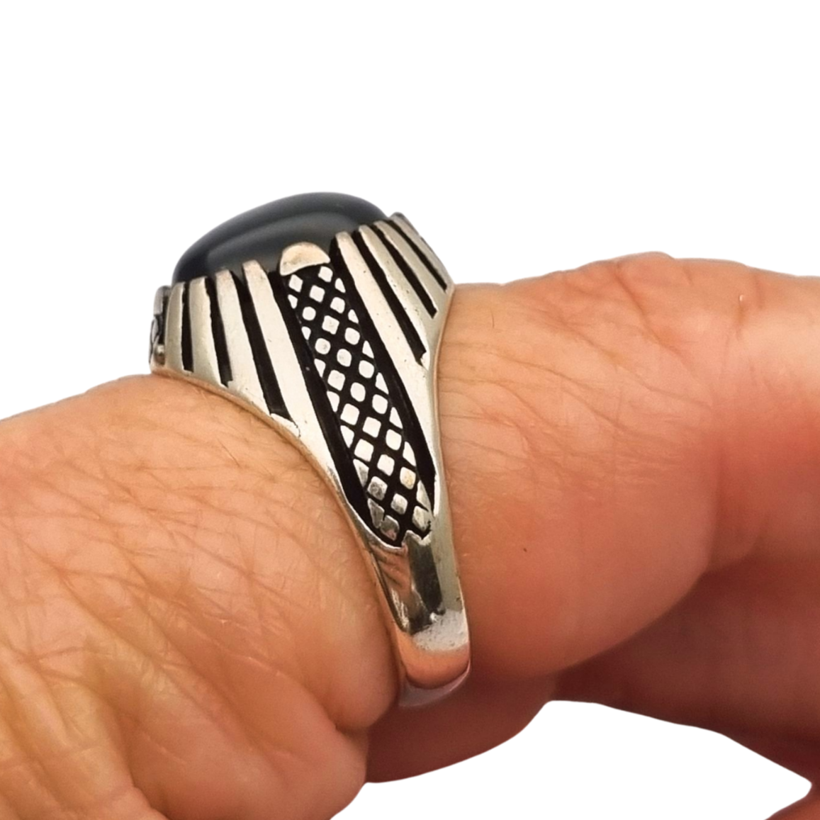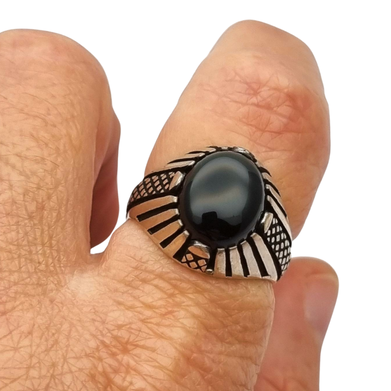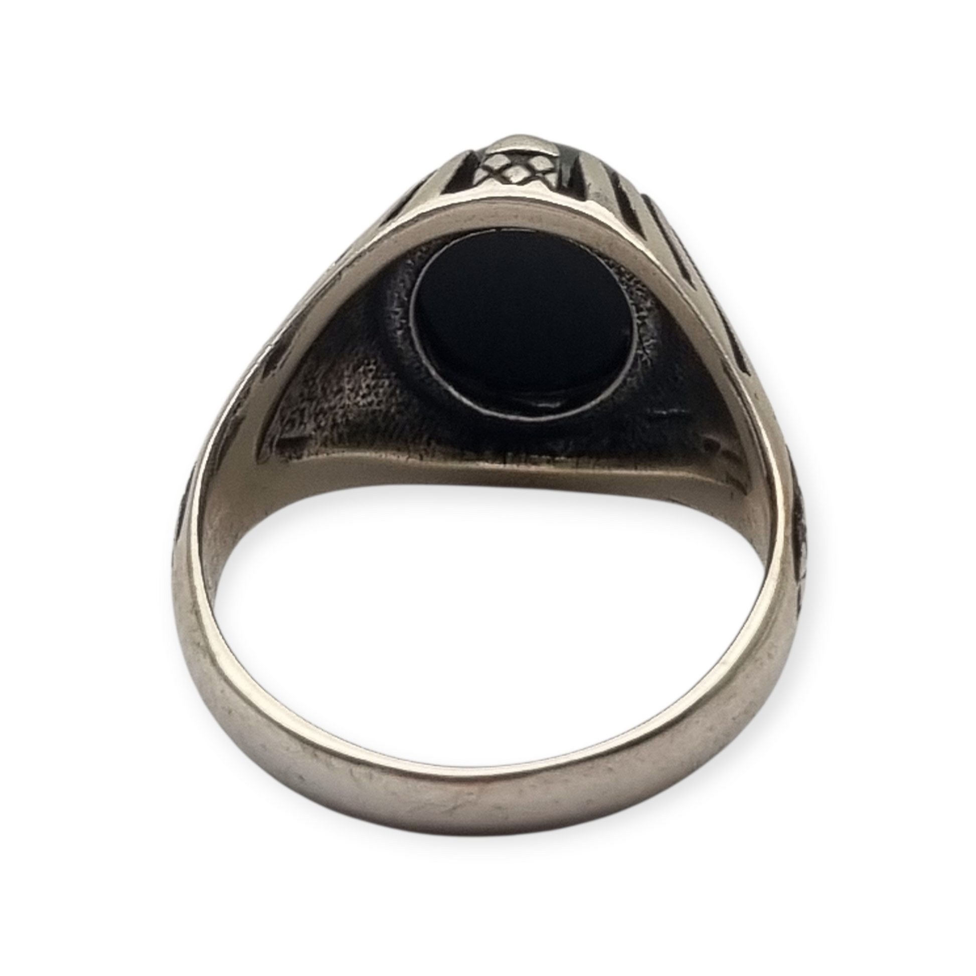 Anillo vintage europeo de los años 80 realizado en plata con cabujón de ónix negro. Presenta un diseño geométrico con decoración calada y líneas radiales que enmarcan la piedra central, creando un estilo vistoso pero elegante. El contraste entre la plata y el ónix oscuro le aporta un carácter clásico y atemporal.