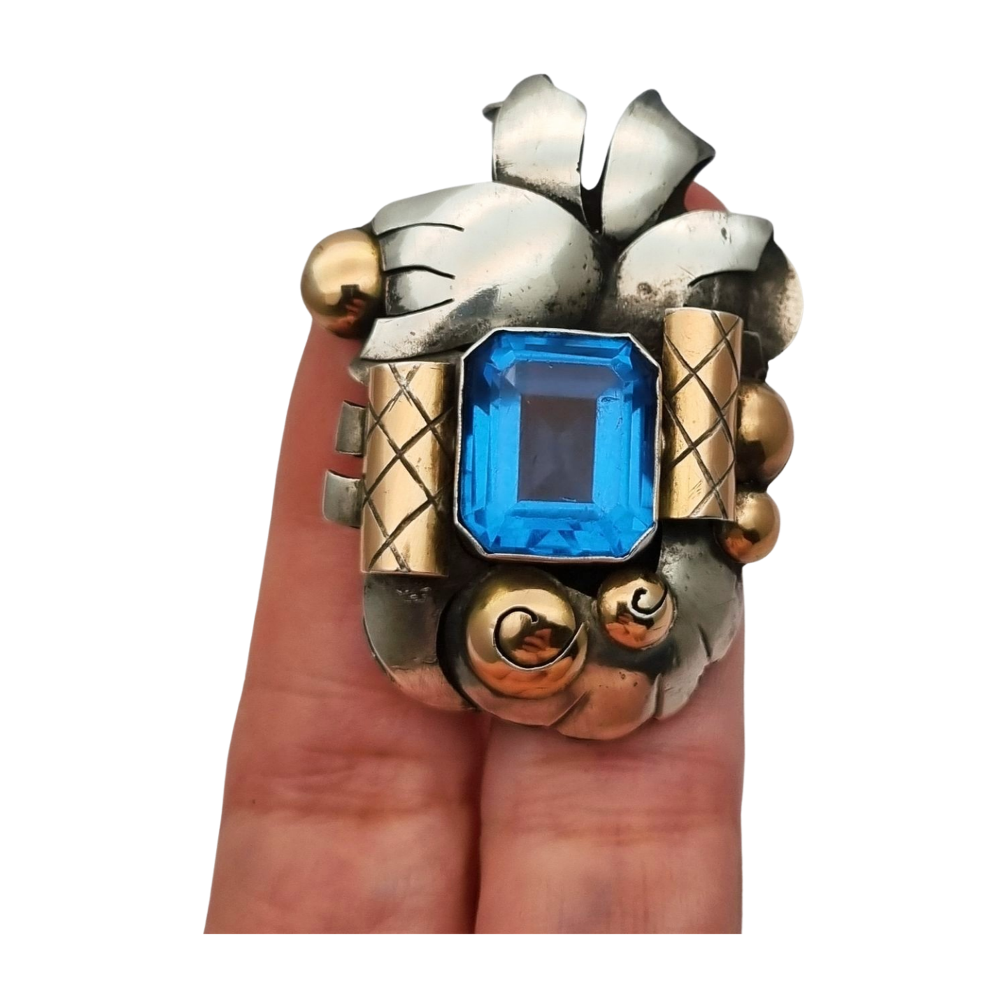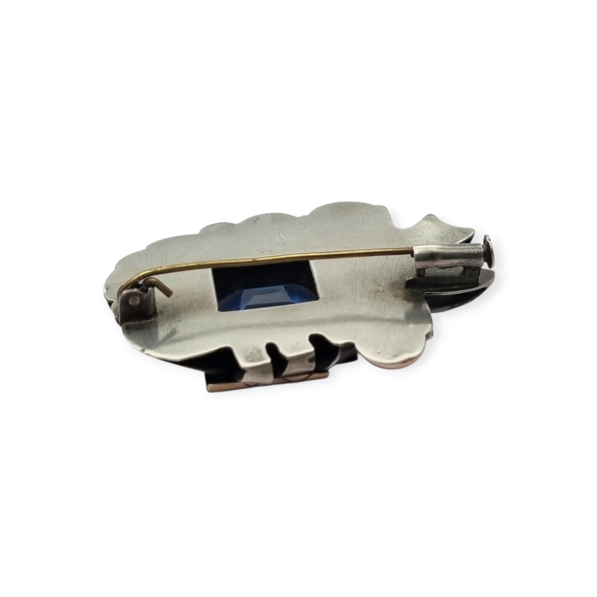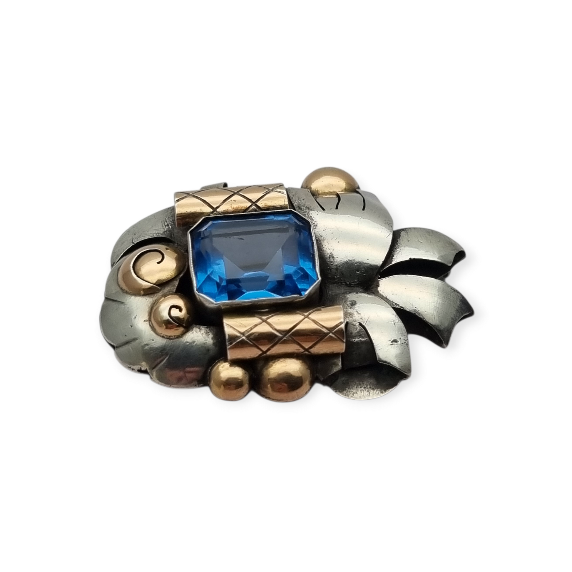 Broche Art Déco en plata con vistas de oro y cristal azul simil aguamarina circa 1930-40. Composición geométrica con volumen y contraste de metales, centrada en un cristal facetado de tono intenso.