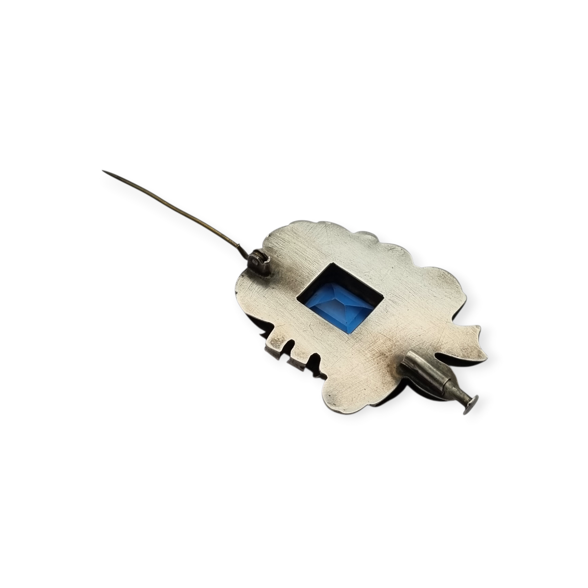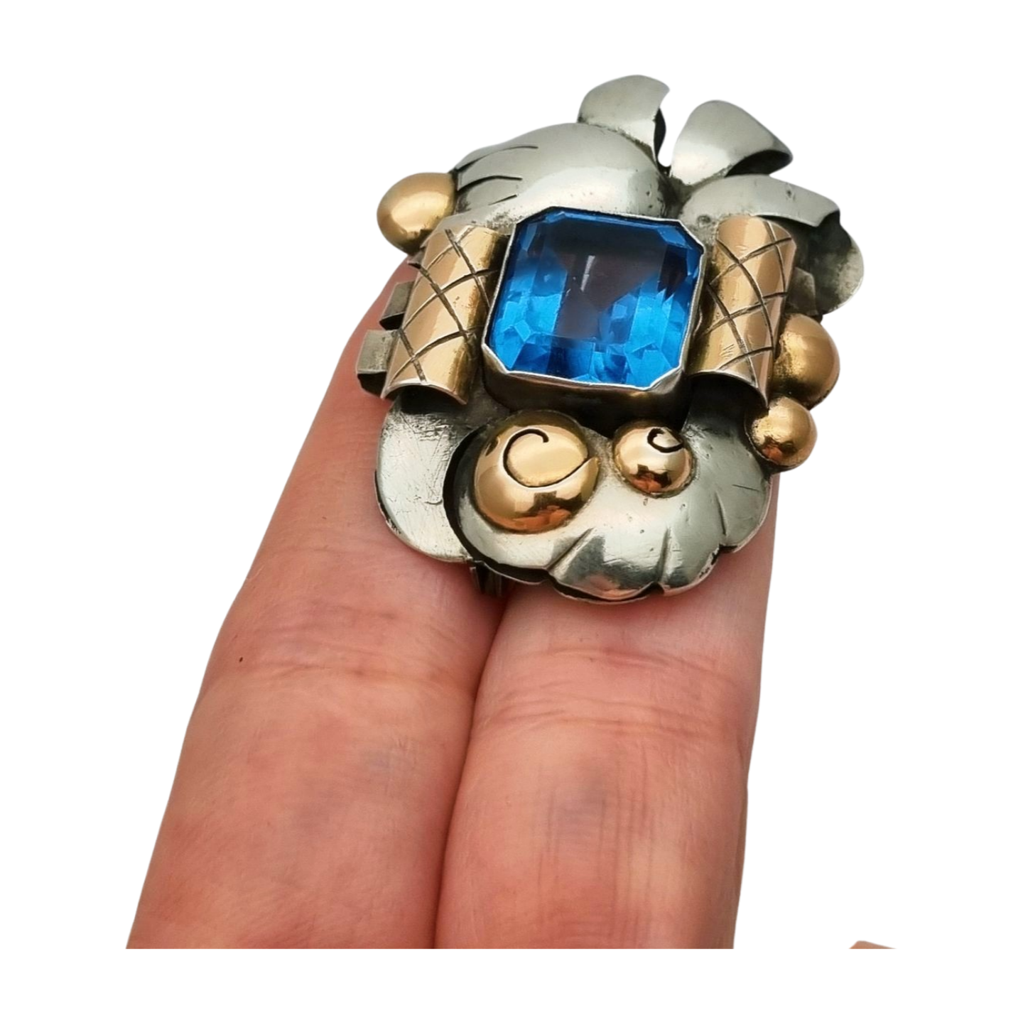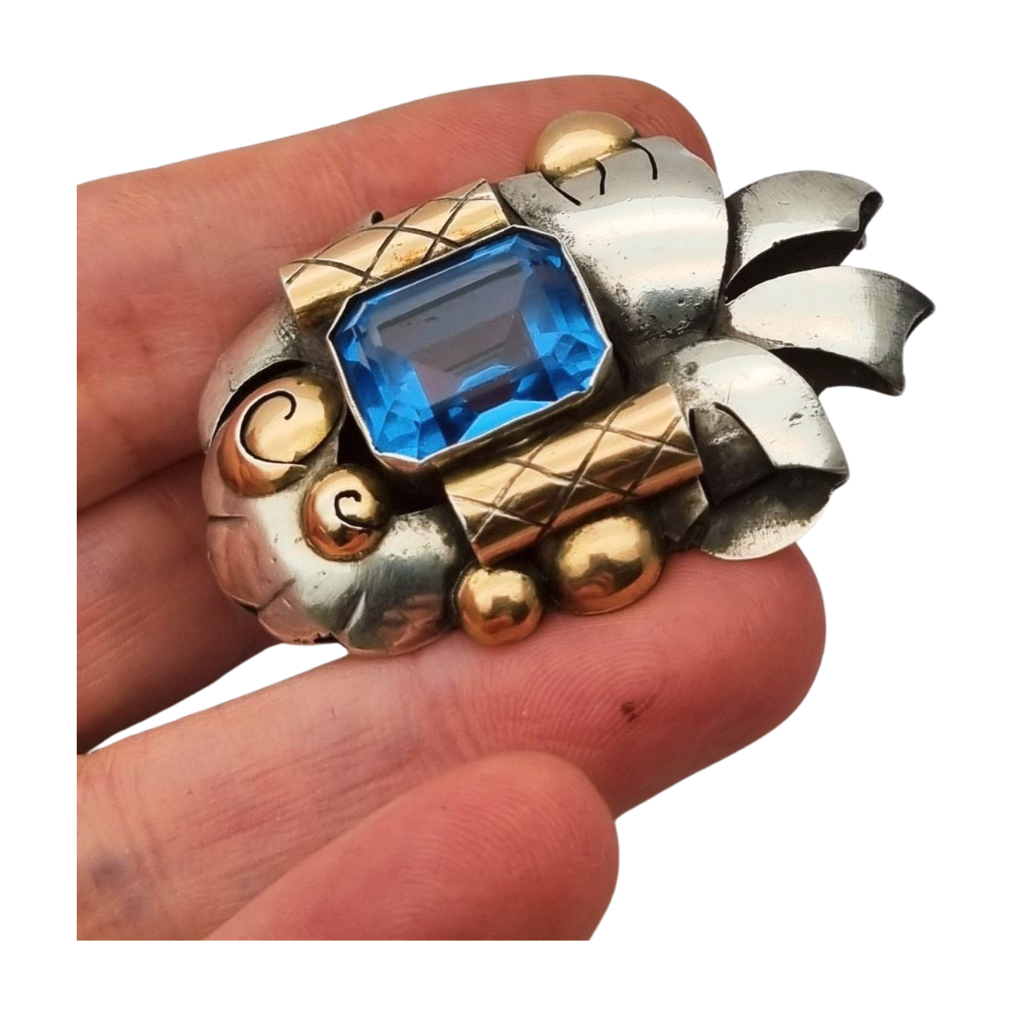 Broche Art Déco en plata con vistas de oro y cristal azul simil aguamarina circa 1930-40. Composición geométrica con volumen y contraste de metales, centrada en un cristal facetado de tono intenso.