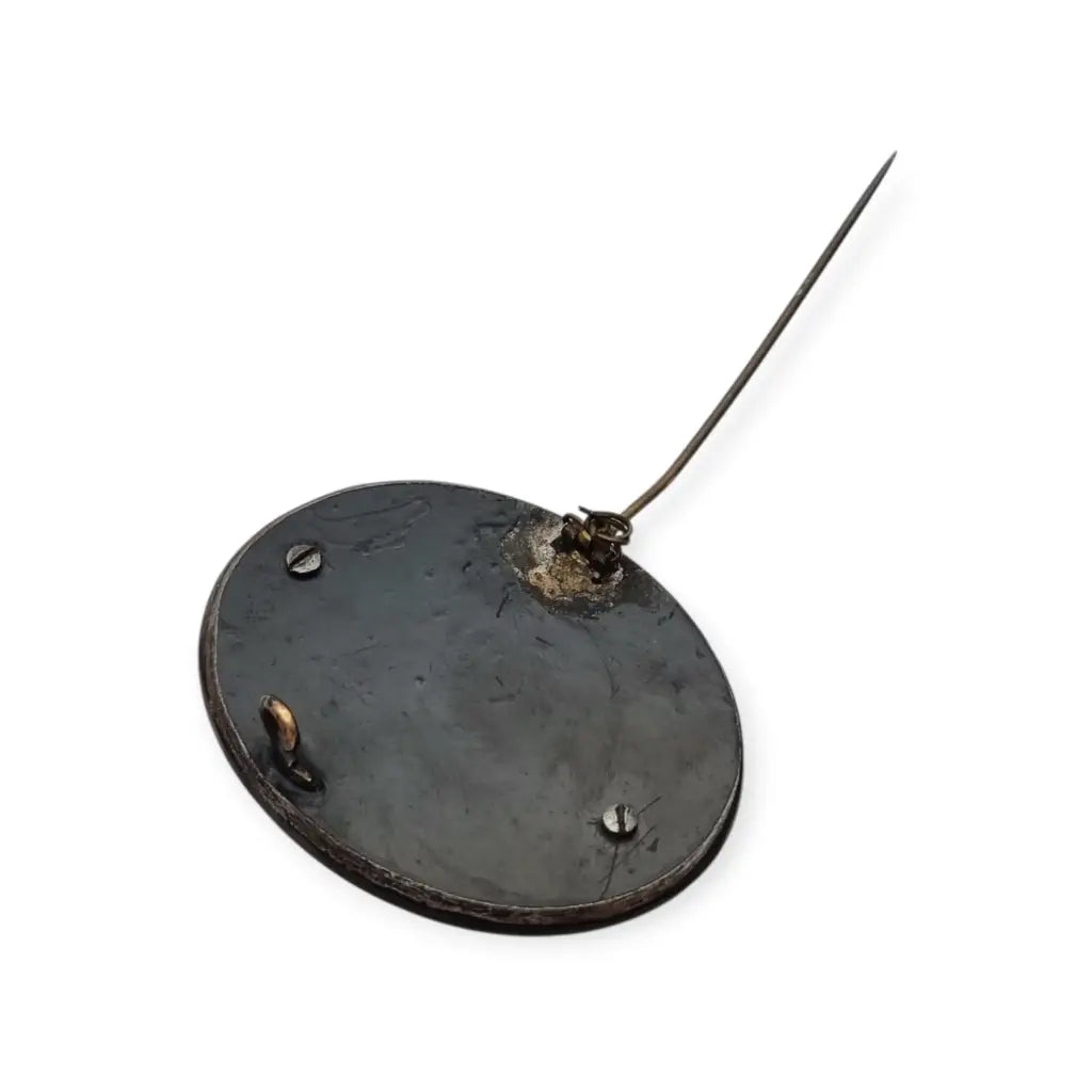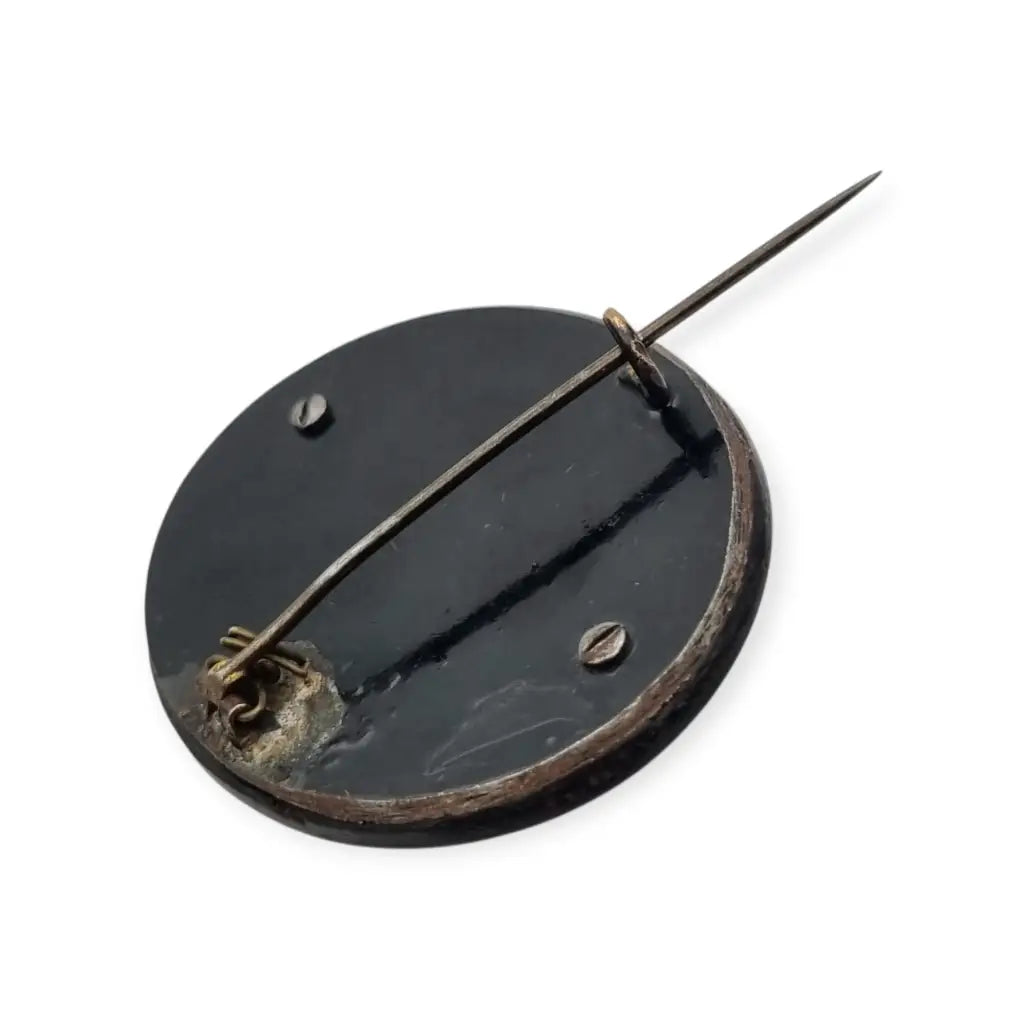 Diseñado para representar el recuerdo de un ser querido, este camafeo negro incorpora flores simbólicas —probablemente margaritas— en una disposición simétrica de excelente artesanía. El cierre largo en forma de C, típico de la época, está montado sobre una base reforzada.