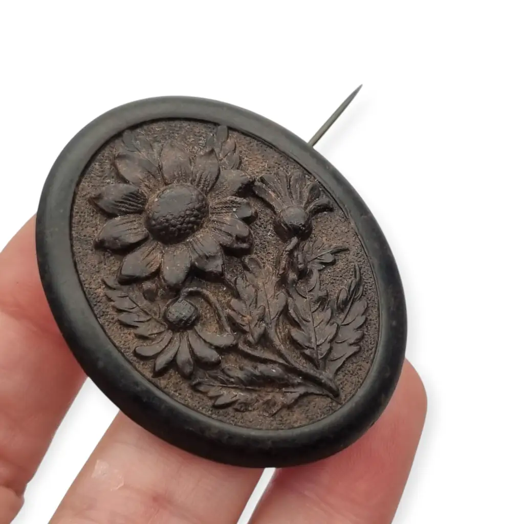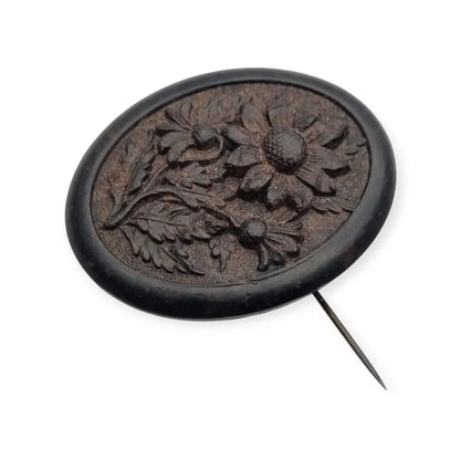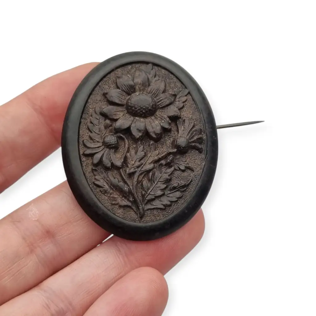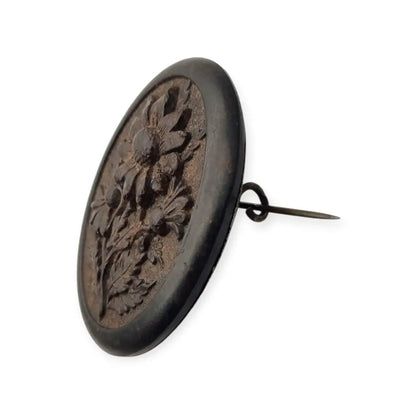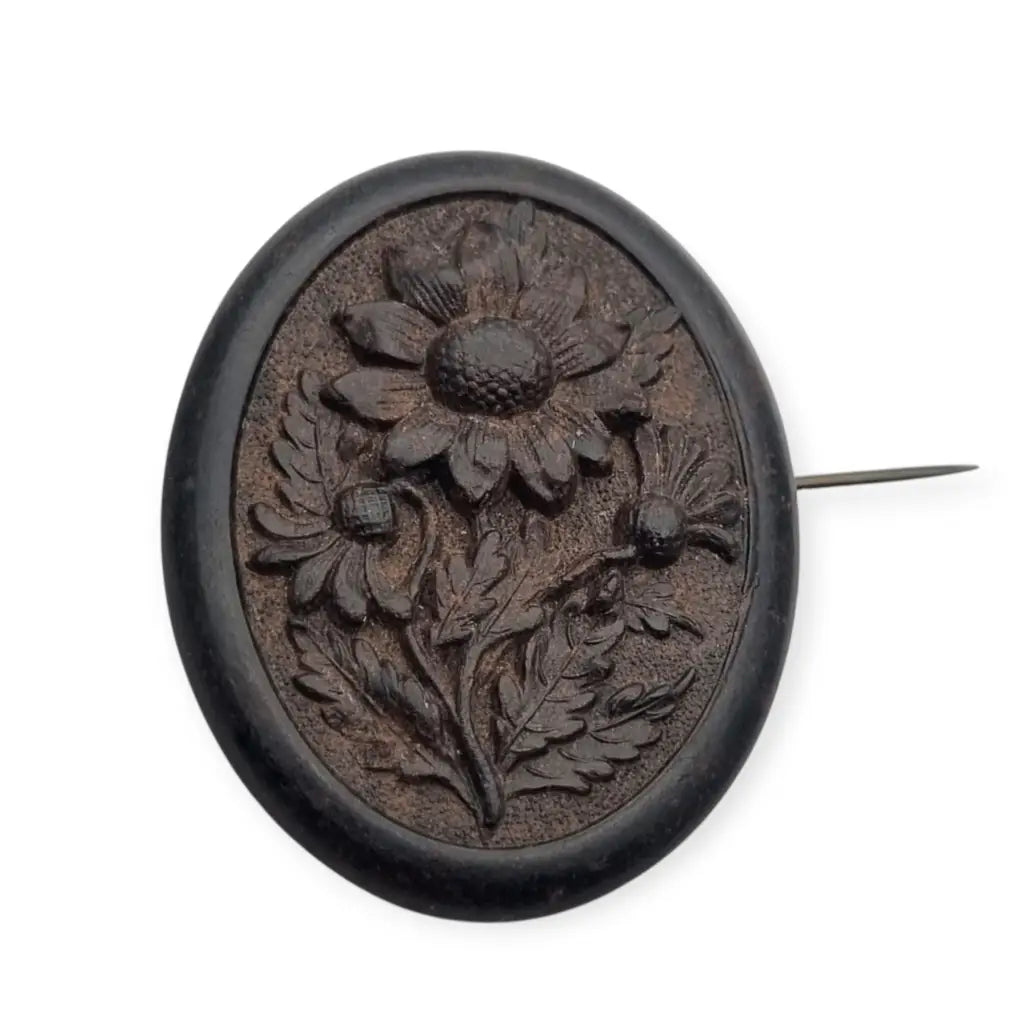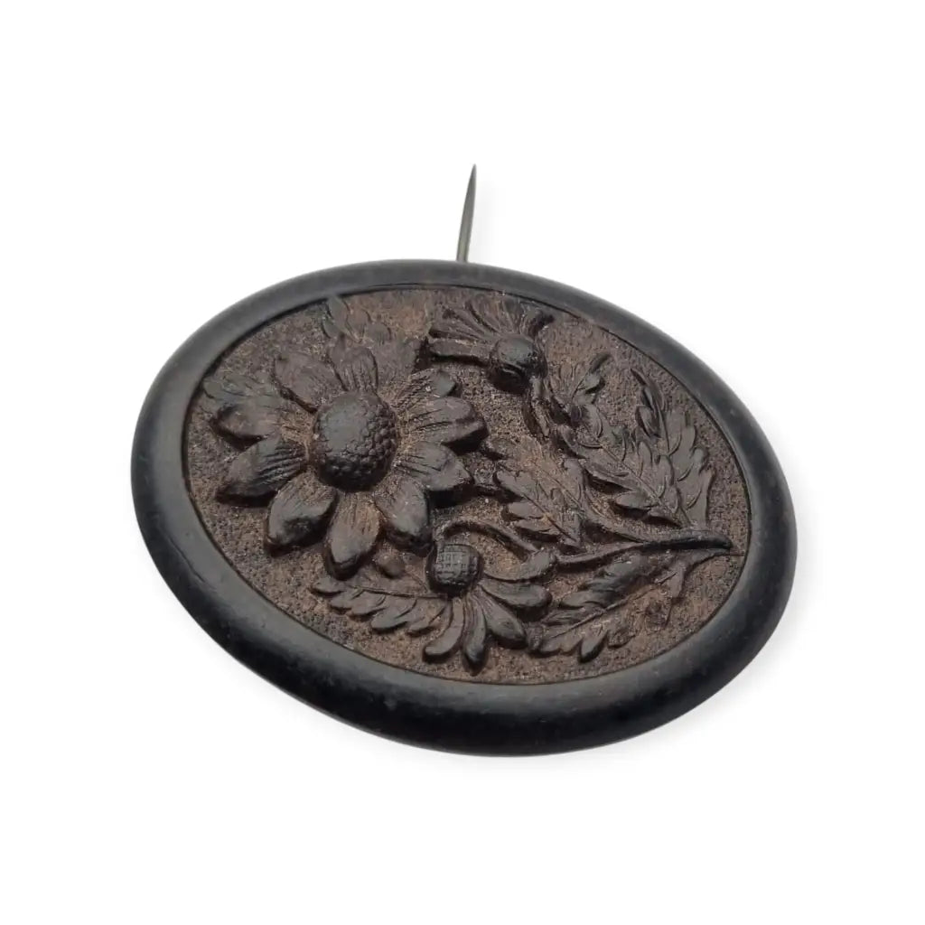 Broche de luto victoriano en camafeo floral negro, flores talladas en vulcanita, circa 1870-1890.