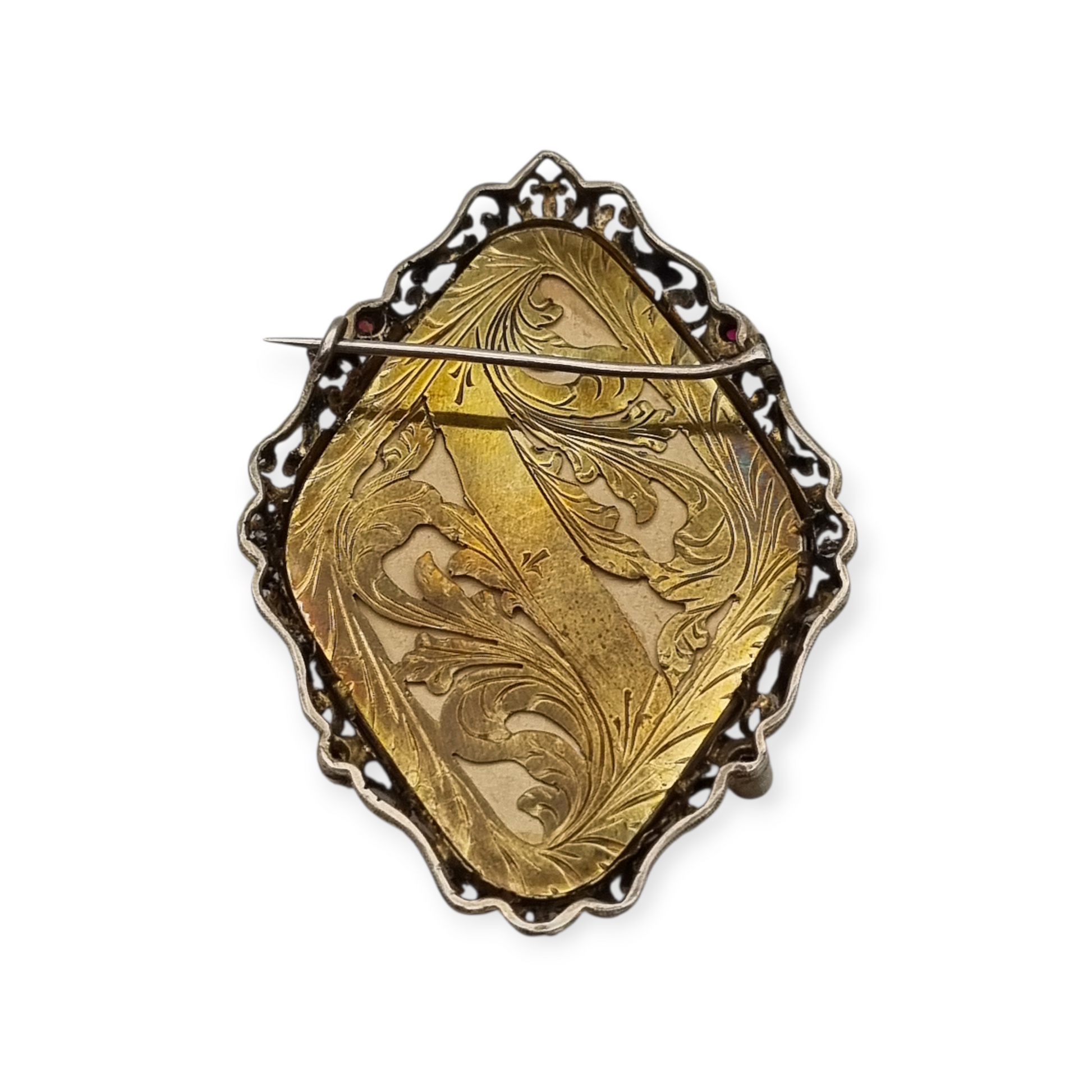 La miniatura representa una dama con estética inspirada en el siglo XVIII, con peinado empolvado y escote bajo, un estilo muy apreciado en la joyería revival durante la época victoriana. El retrato está firmado por el miniaturista europeo Vultur. La montura presenta delicado trabajo calado en plata con roleos ornamentales y cuatro cristales rojos color rubí. En la parte posterior se encuentra una placa grabada con motivos vegetales realizada en vermeil.