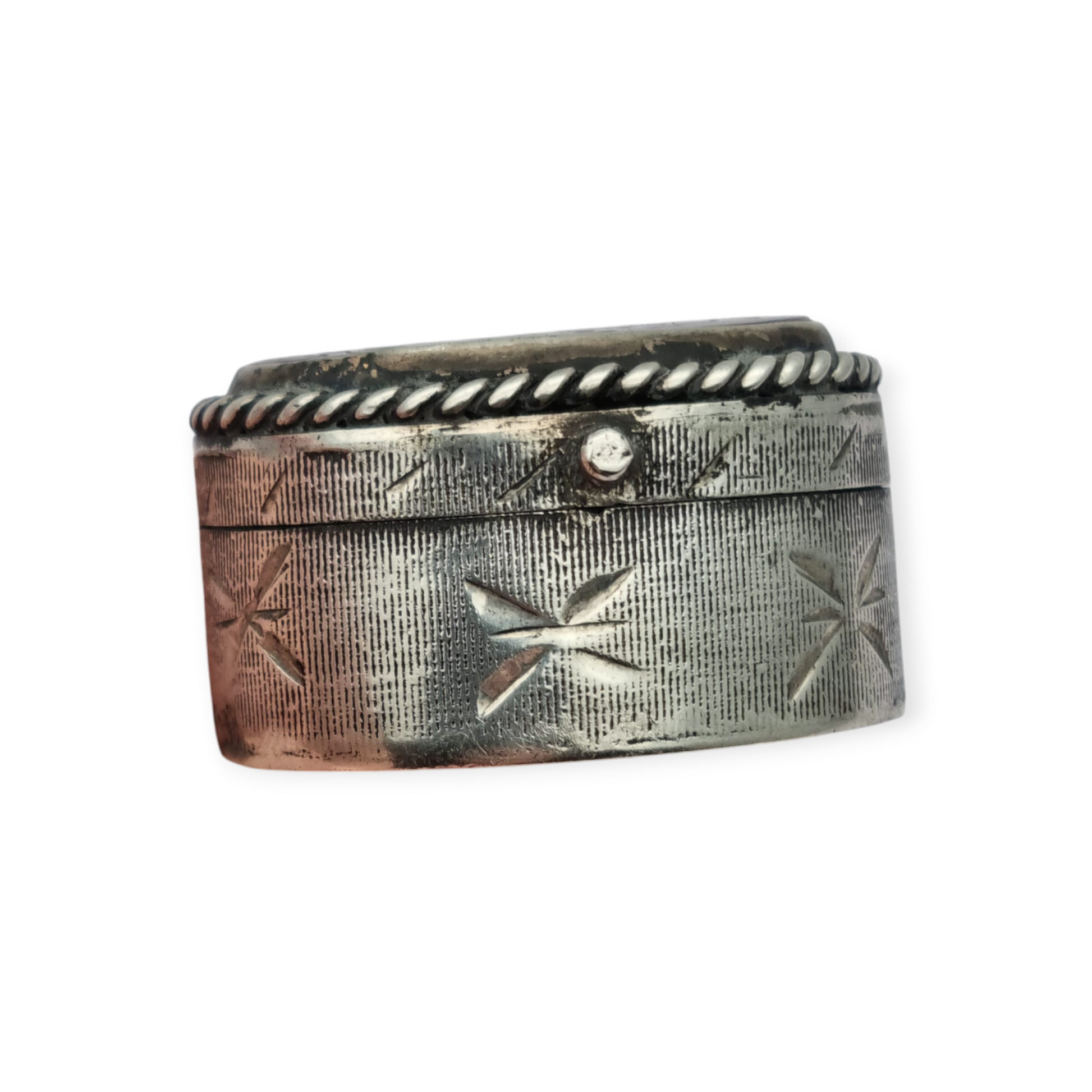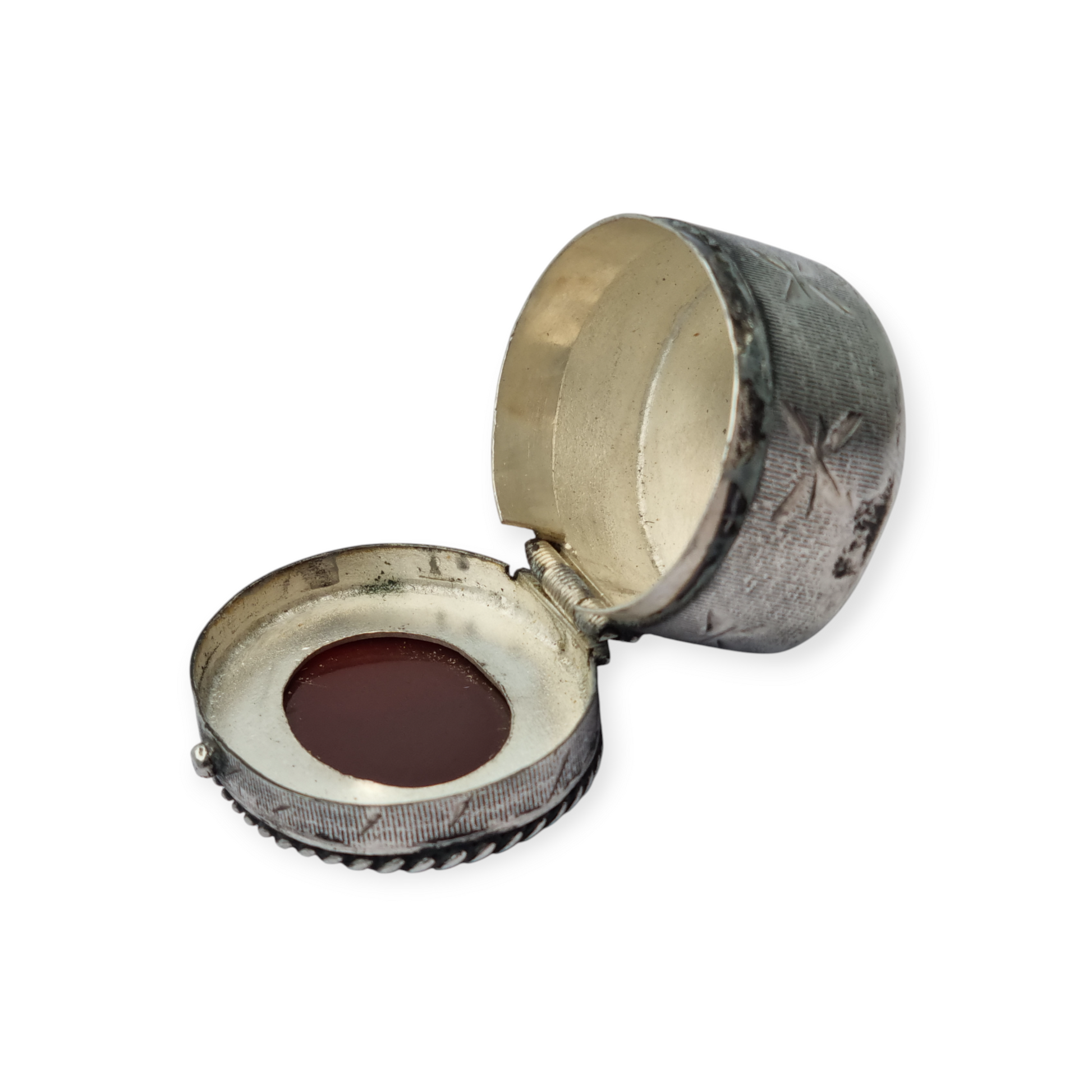 Este tipo de cajas eran usadas para guardar pequeños objetos de valor, como amuletos, perfumes sólidos o tabaco. La cornalina, tradicionalmente asociada a la protección y la espiritualidad, era muy utilizada en culturas del Medio Oriente y Asia. La inscripción caligráfica refuerza el simbolismo de la pieza. La decoración incisa y el trabajo de filigrana en plata revelan una artesanía detallada.