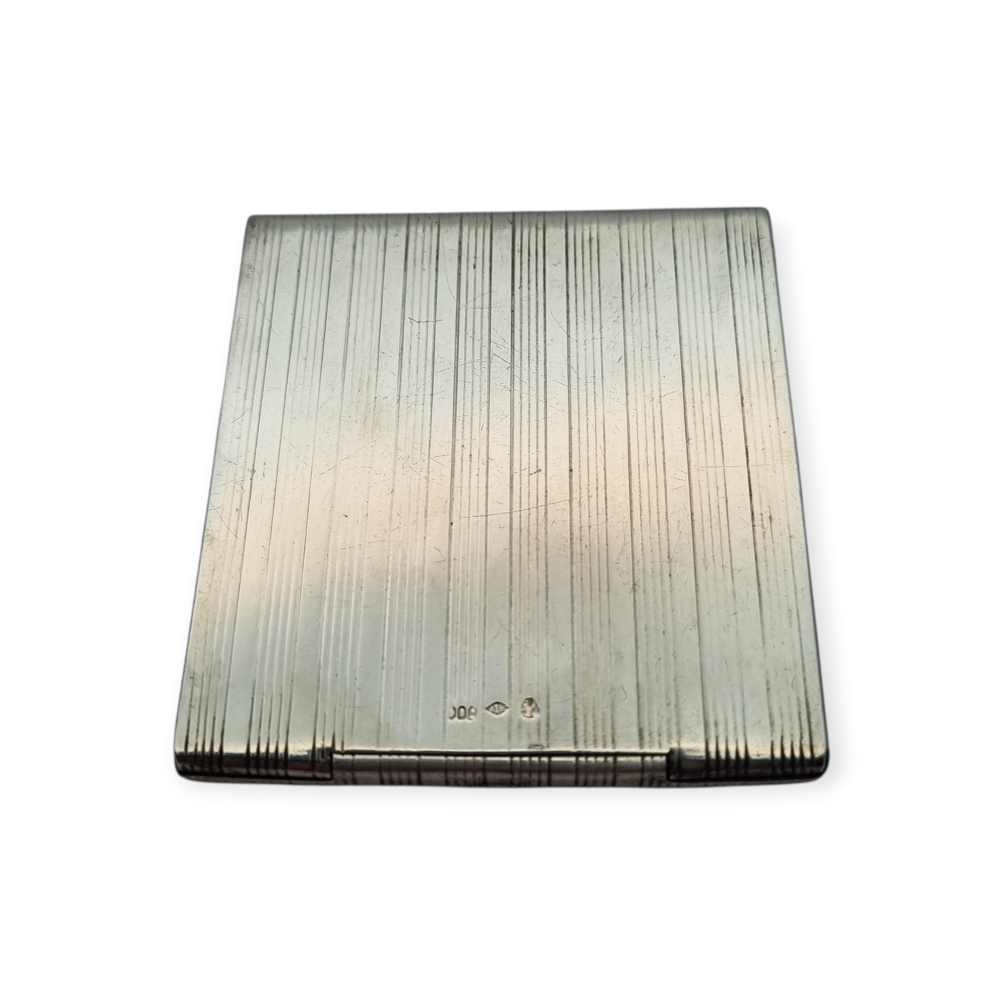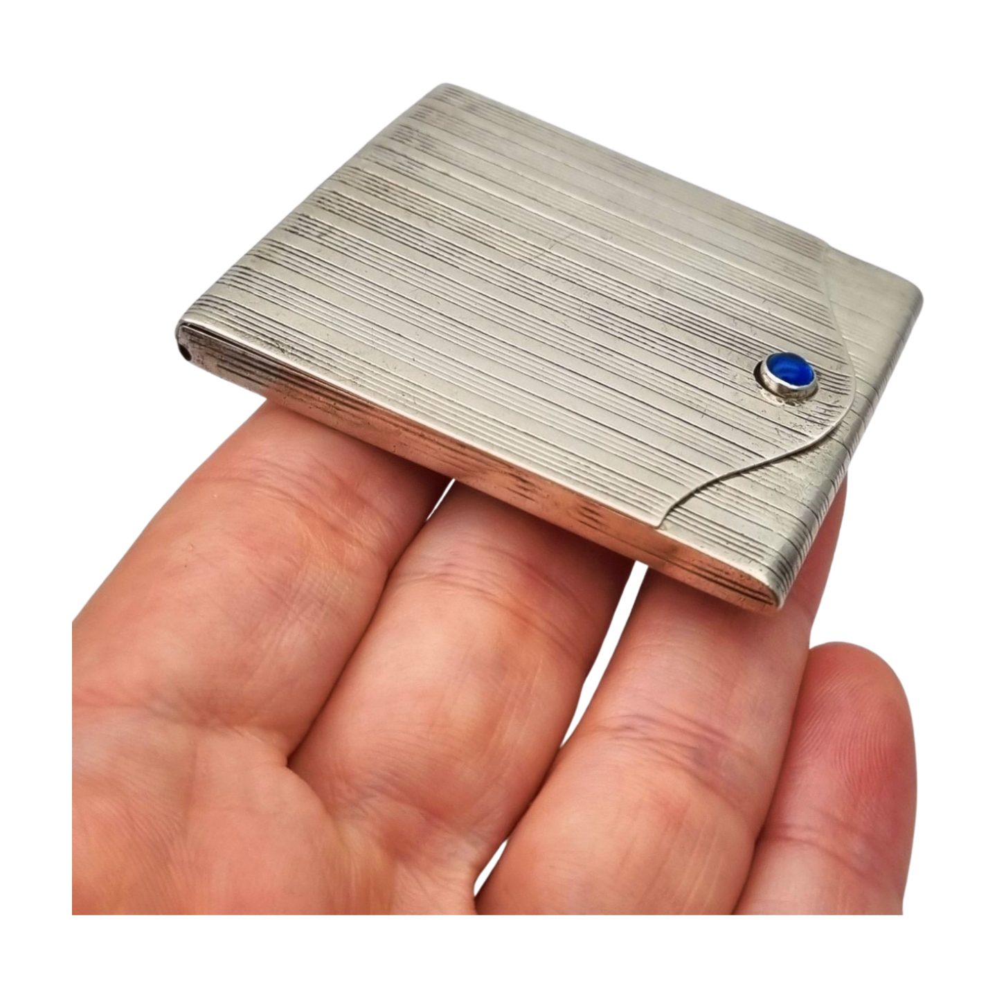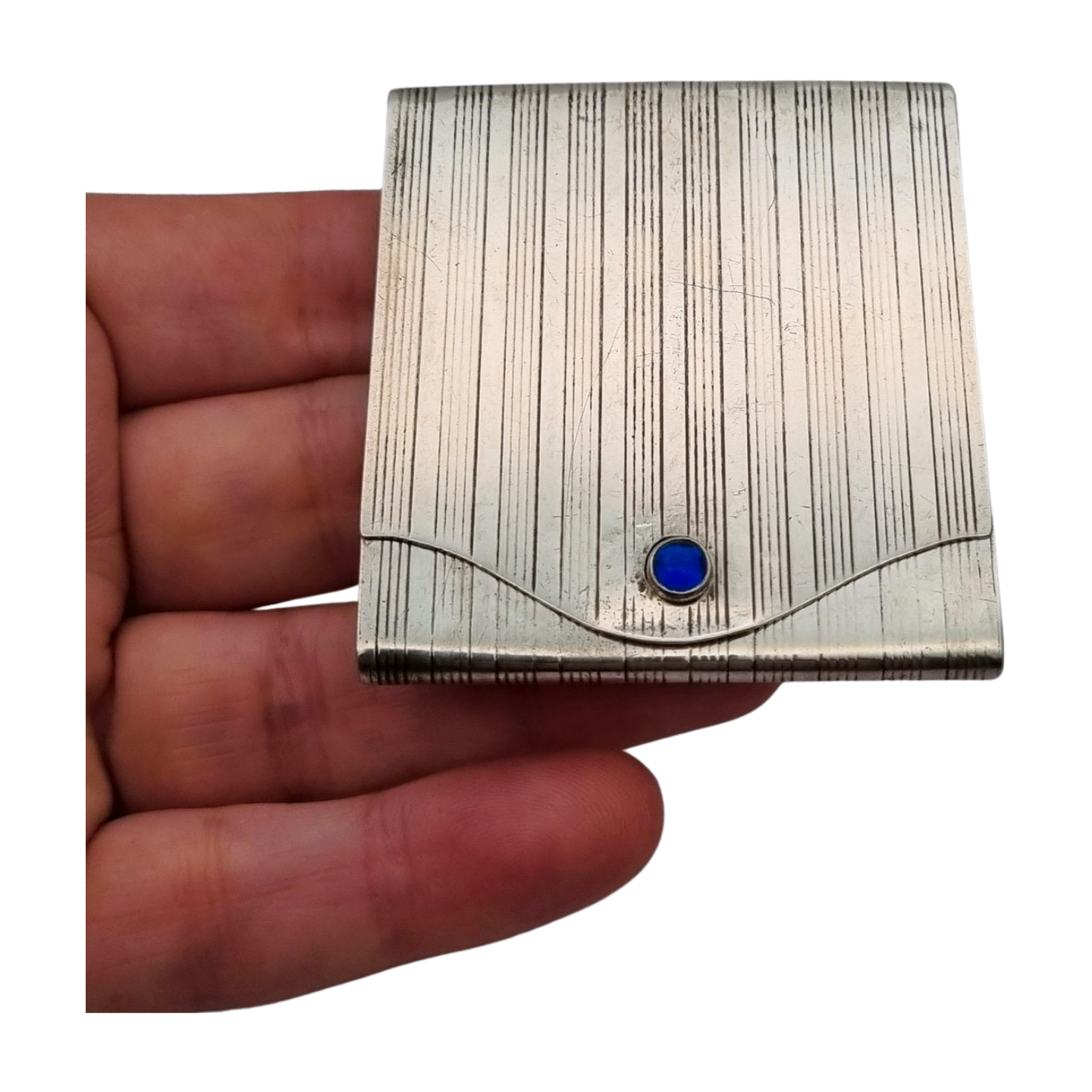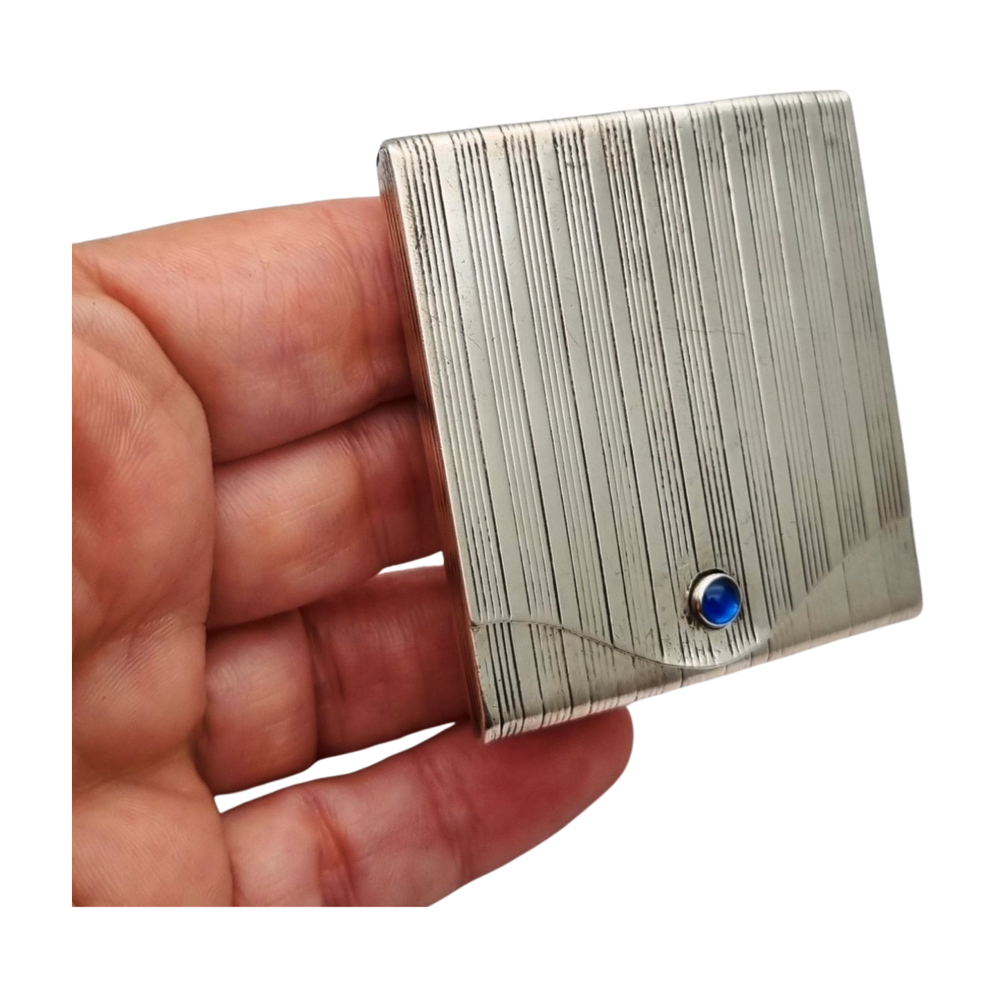 Presenta un diseño geométrico con finas líneas paralelas grabadas que recorren toda la superficie, típico del gusto funcional y elegante de la época. La tapa incorpora un cabujón de cristal azul que actúa como elemento decorativo y punto focal. Pieza compacta y práctica, representativa de los objetos personales de uso cotidiano con diseño cuidado.
