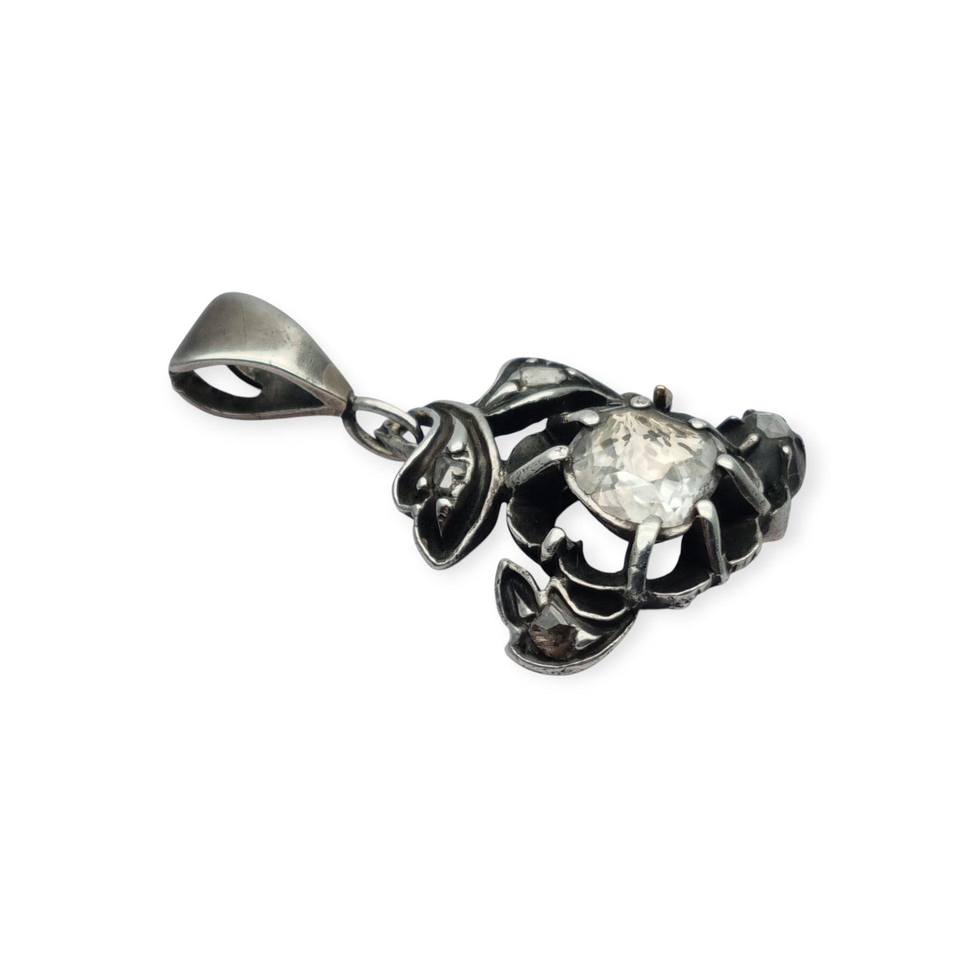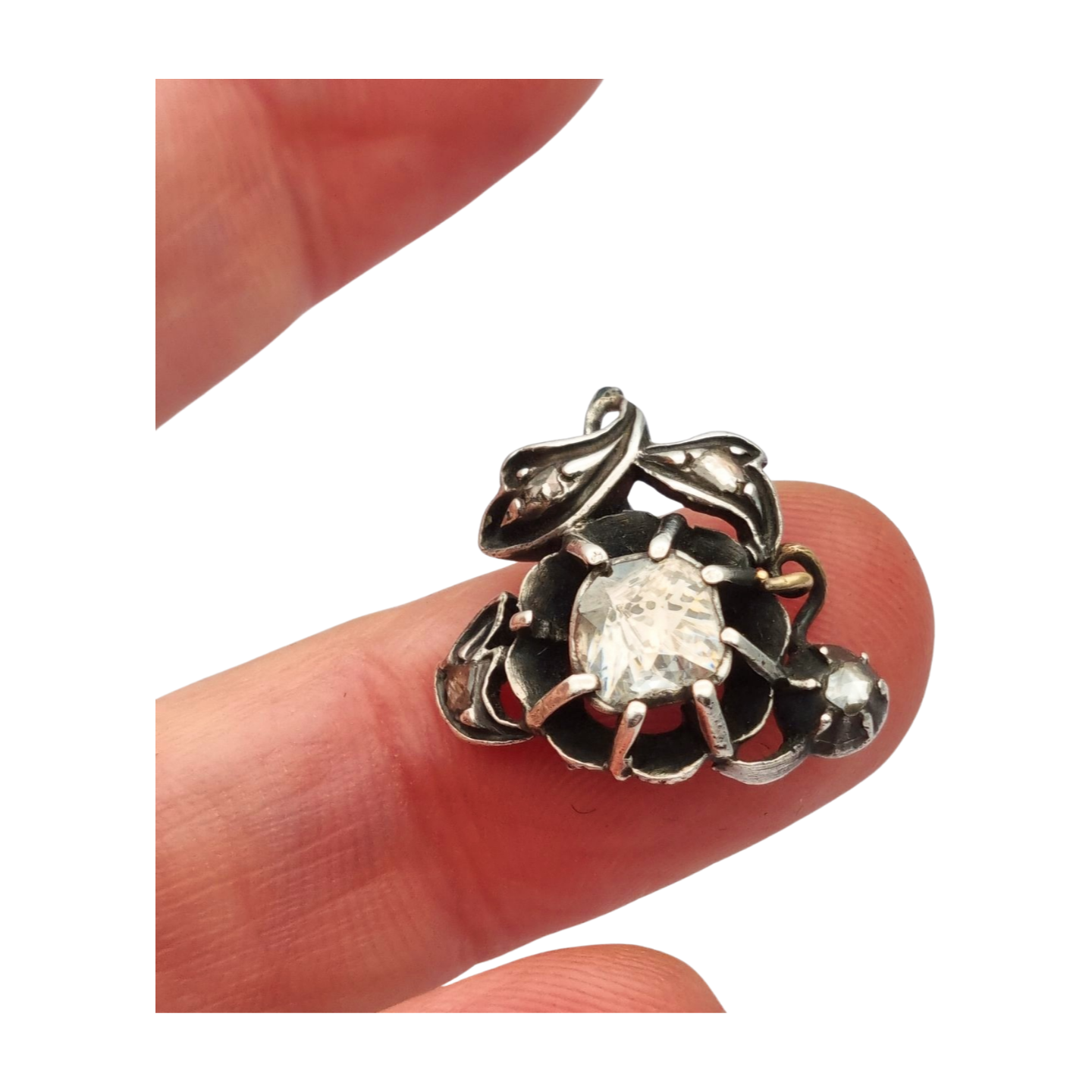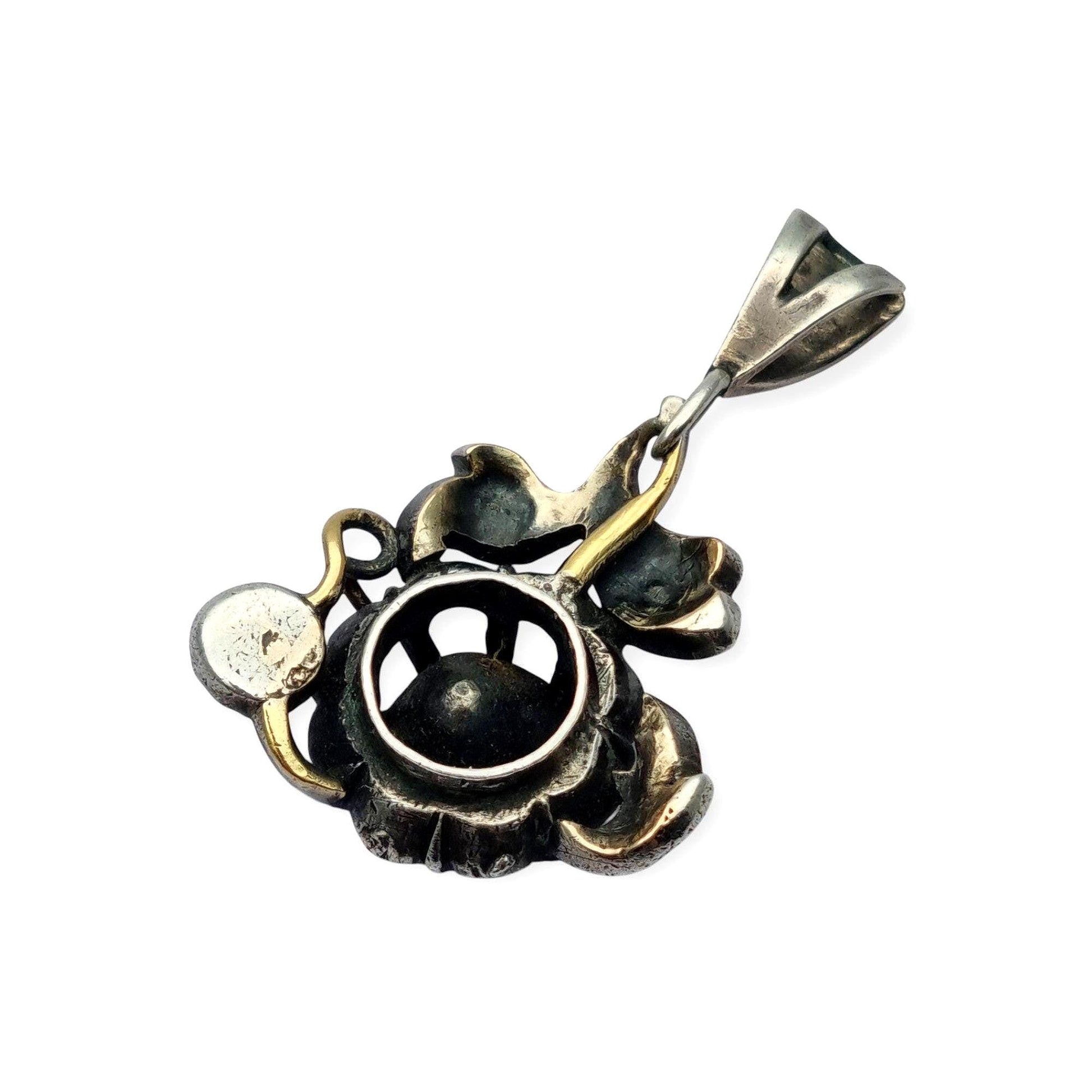 Diseñado con un motivo de flor central que abraza un diamante de talla antigua, este colgante muestra un fino trabajo en plata con aplicaciones parciales de oro, visibles en el reverso. La composición evoca la elegancia del periodo victoriano, caracterizado por su simbología botánica. La piedra principal mide 6,4 mm de ancho y destaca por su luz y talla manual. Ideal para coleccionistas o como joya de época para lucir.