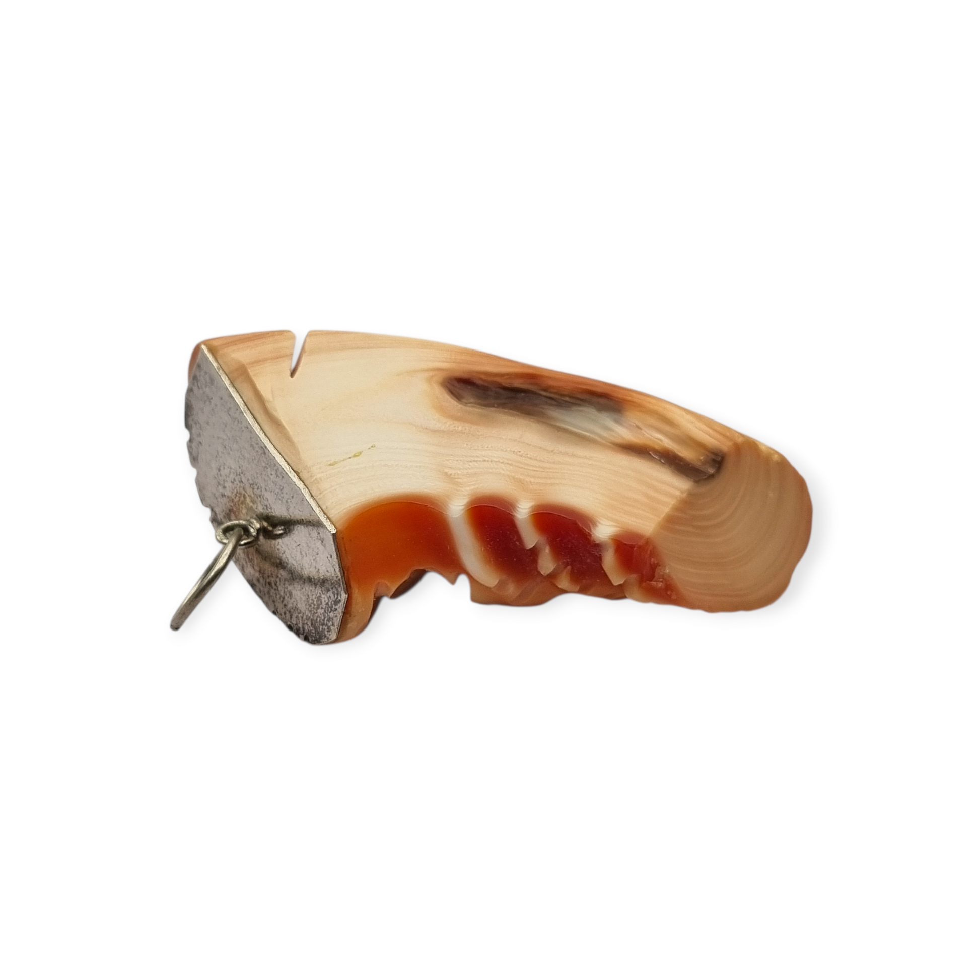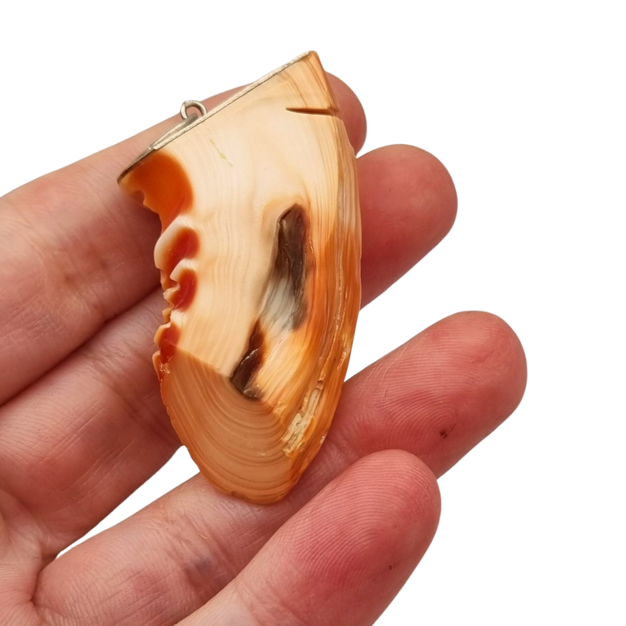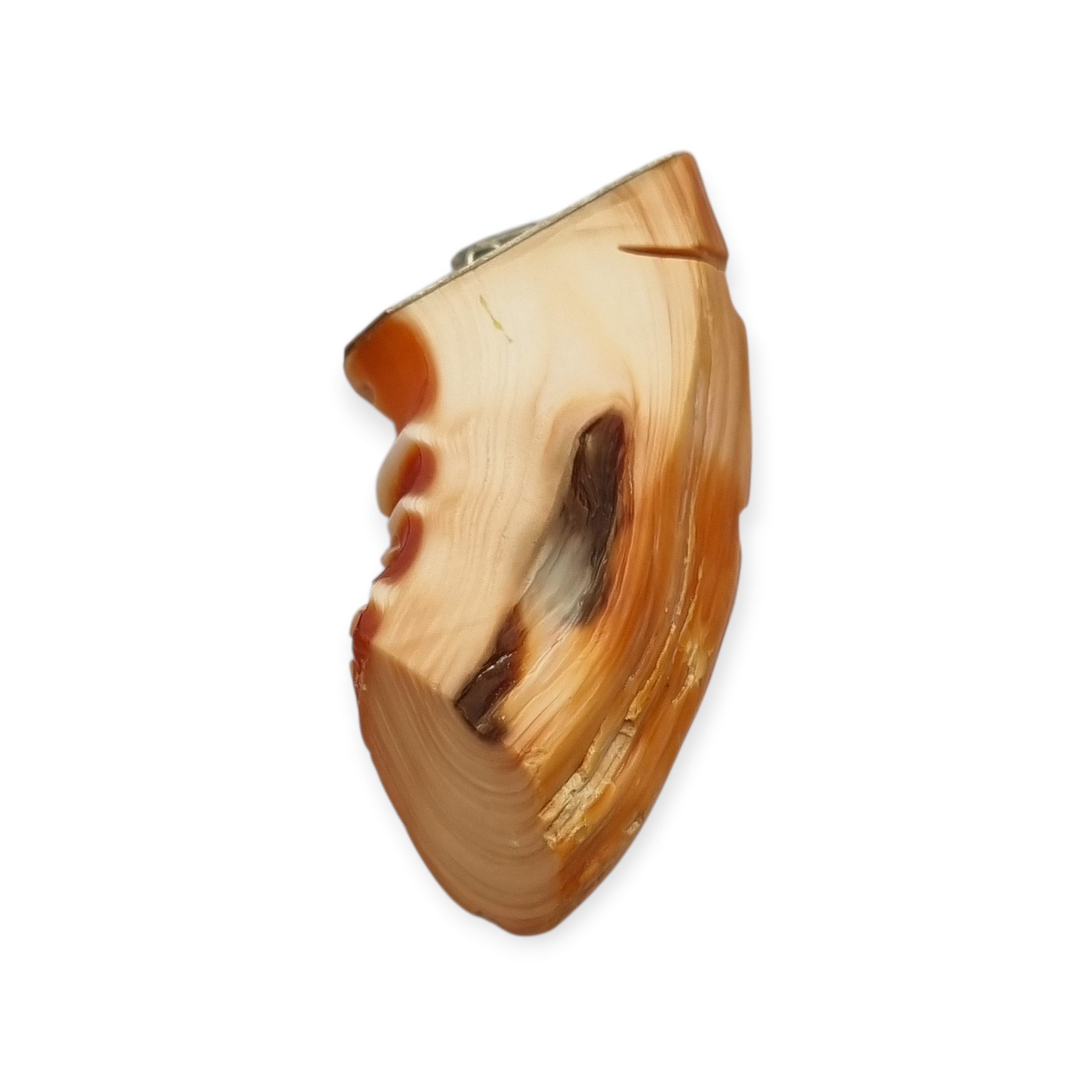 Collar con colgante de coral piel de ángel tallado en forma de máscara oriental, montado en plata de los años 60-70. Pieza de carácter escultórico con relieve definido y rasgos expresivos, donde destacan las vetas naturales del coral en tonos crema y anaranjados. Incluye cadena de plata de 62 cm. Este tipo de tallas fue apreciado en joyería asiática por su valor decorativo y simbólico.