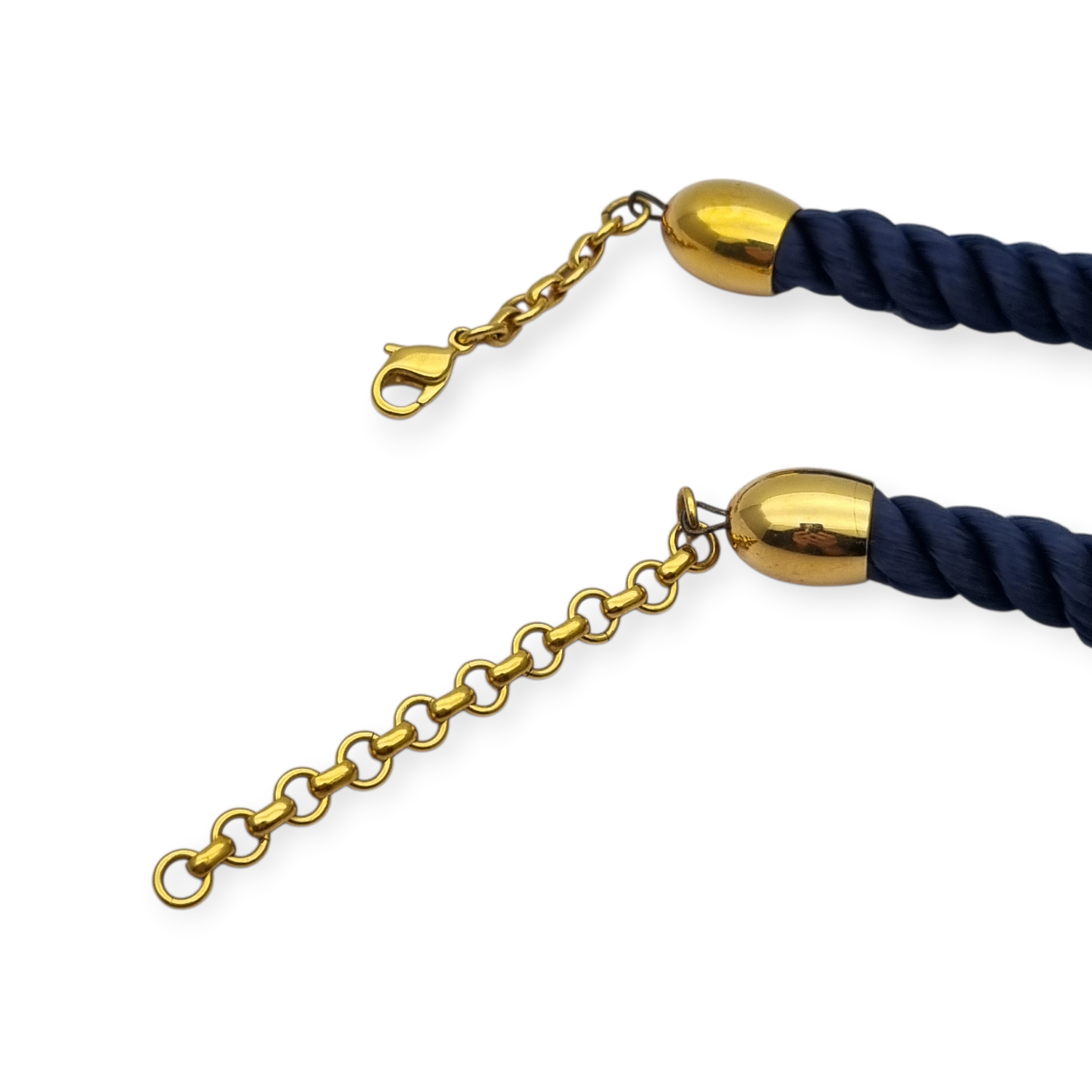 - Materiales: Esmalte, cordón textil y metal con chapado de oro.