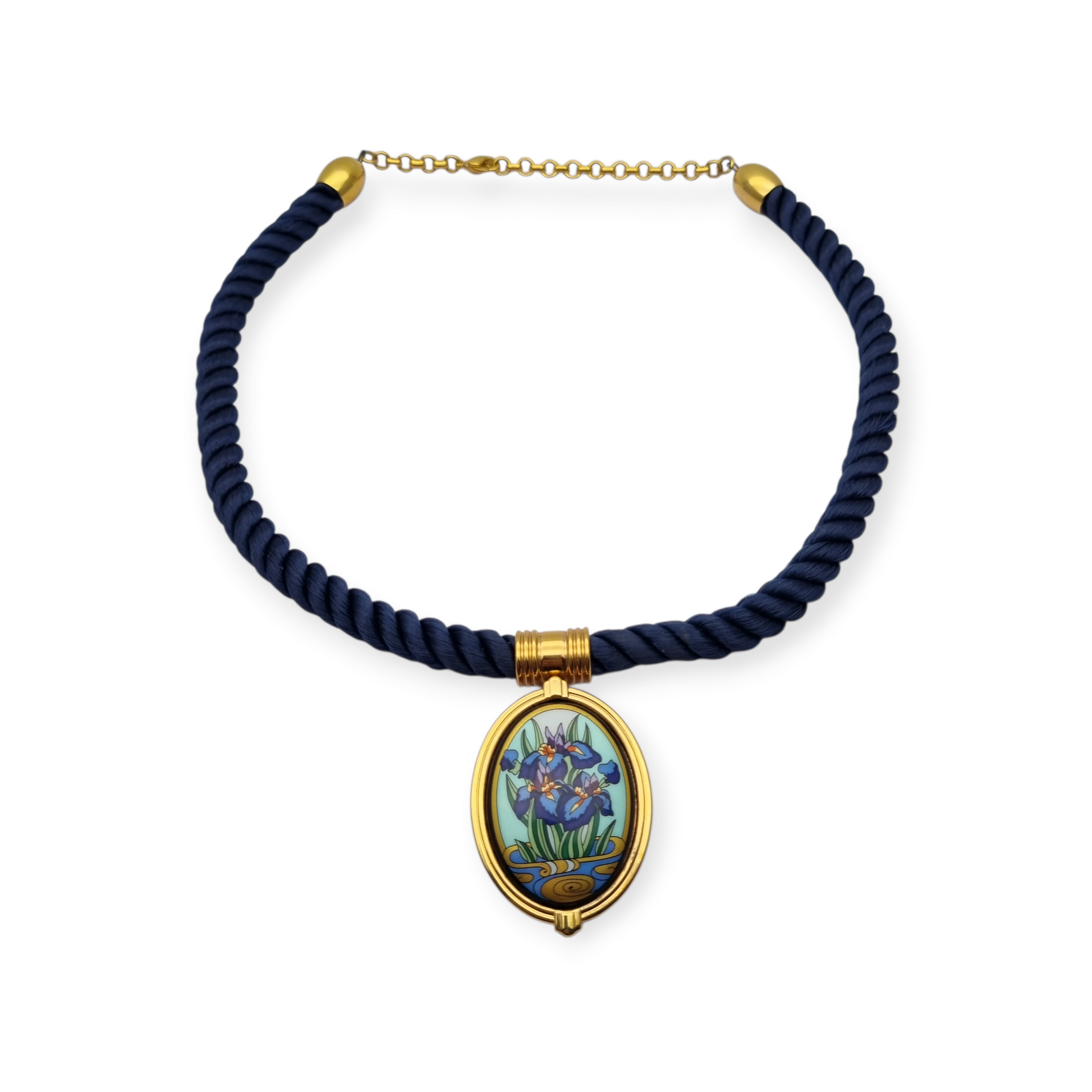 Collar esmaltado de iris Michaela Frey Wien circa 1980-90 con cordón azul. Colgante oval chapado en oro con esmalte floral.
