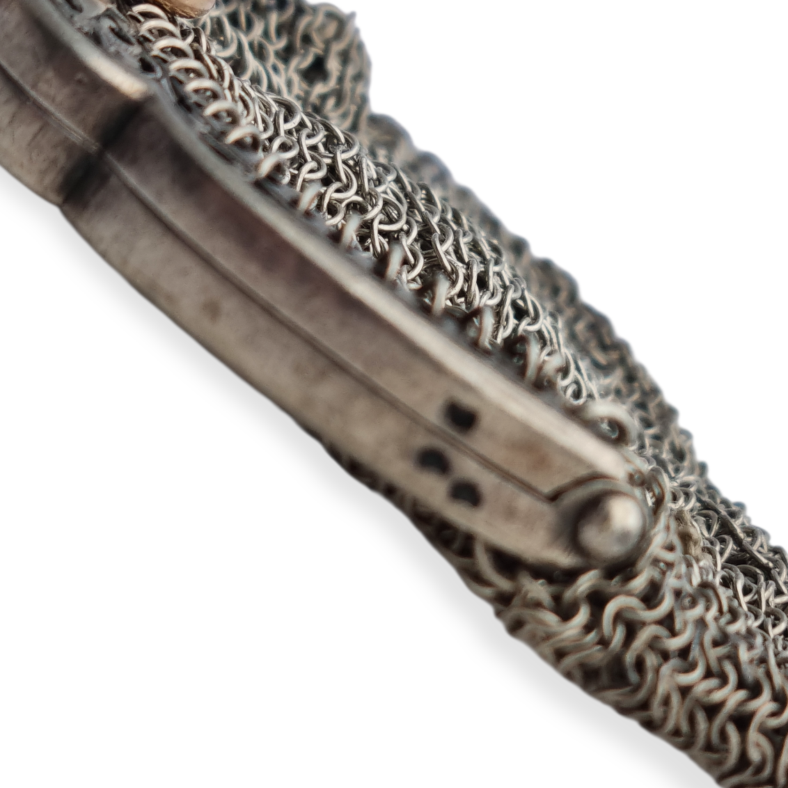 La estructura presenta montura decorada con motivos curvilíneos propios del estilo modernista y cuerpo de malla metálica entrelazada. El contraste entre la plata y los elementos en oro aporta un detalle distintivo en la parte superior. Este tipo de monederos eran habituales a comienzos del siglo XX como complemento de paseo o de evening bag, utilizados para portar monedas y pequeños objetos personales.