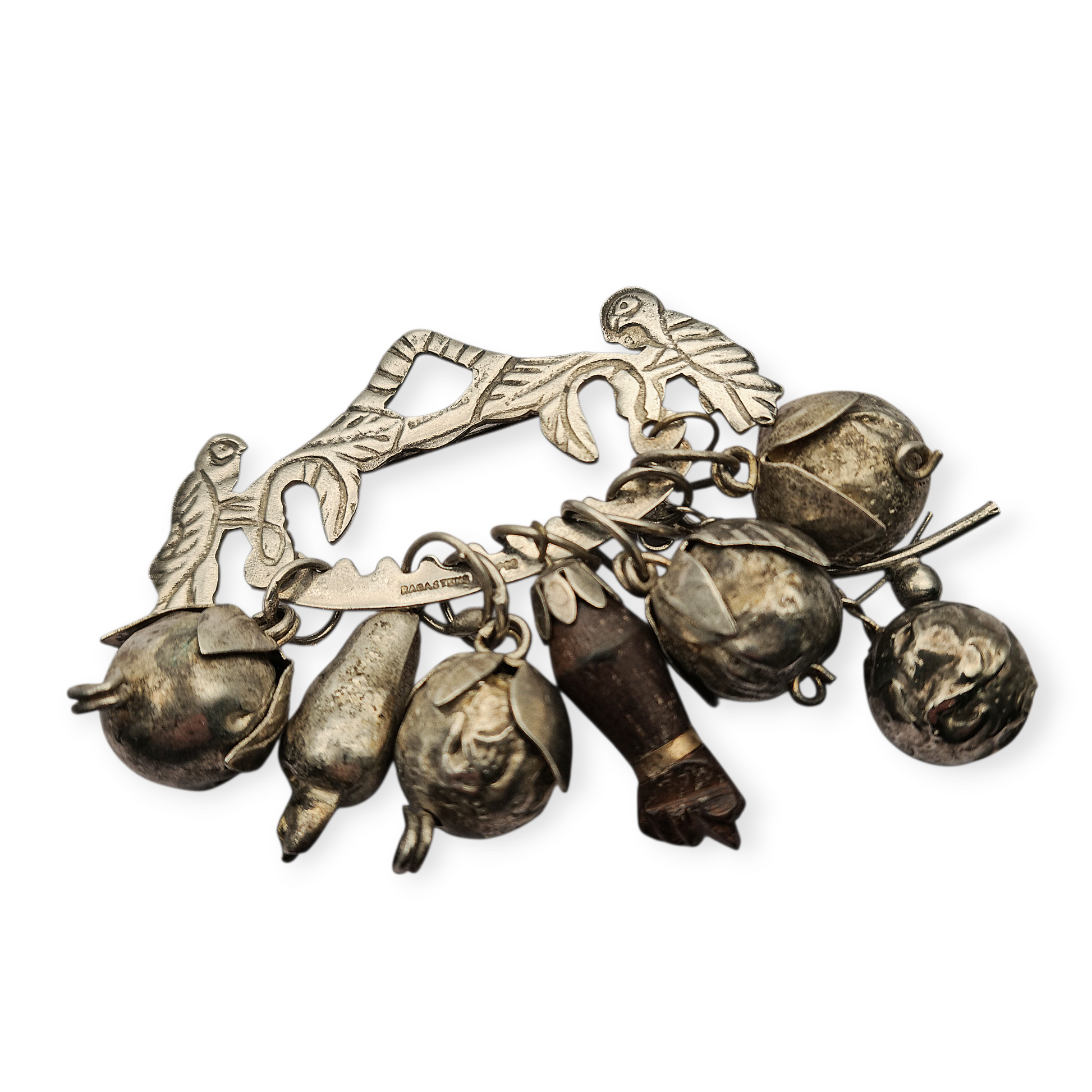 Penca Brasileña de Balangandán Ragastens, broche en plata 900 con aves afrontadas y múltiples amuletos colgantes articulados.