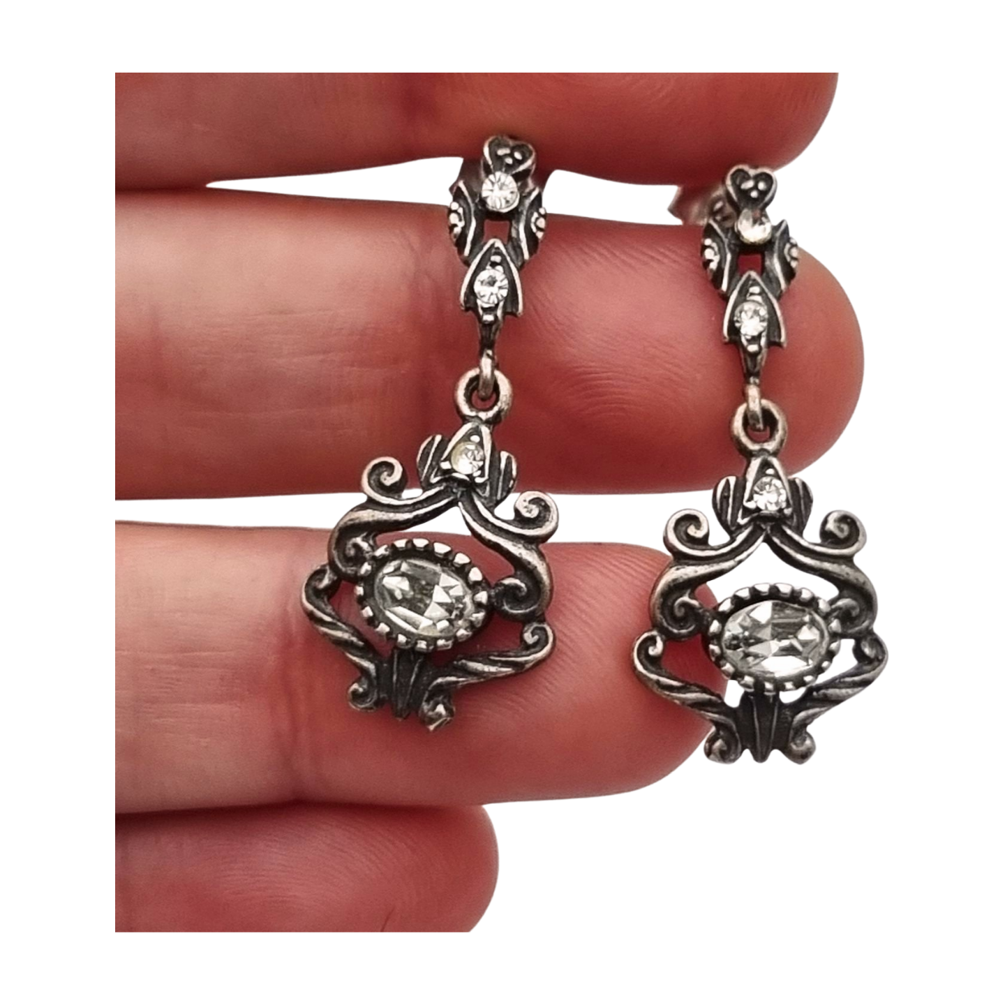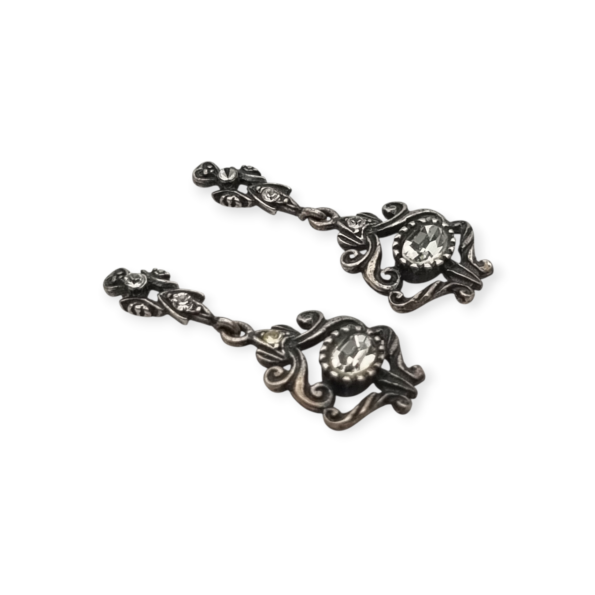 Presentan una composición ornamental de inspiración barroca con volutas y formas decorativas, combinadas con piedras blancas facetadas que aportan brillo. El diseño recuerda a joyería regional española reinterpretada en el siglo XX. Cierre de presión. Piezas llamativas con carácter decorativo y aire vintage.