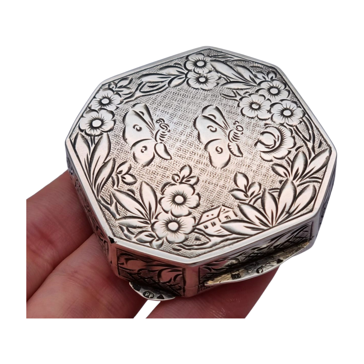 Polvera antigua octogonal en plata 800 grabada con mariposas y flores, circa 1950