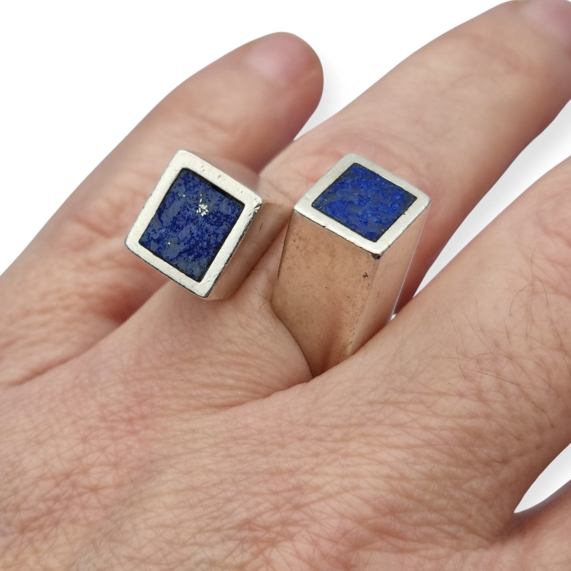 Vintage brutalist design ring, made of 925 silver with two square cabochons of natural lapis lazuli mounted on opposite ends of an open structure of geometric volumes.