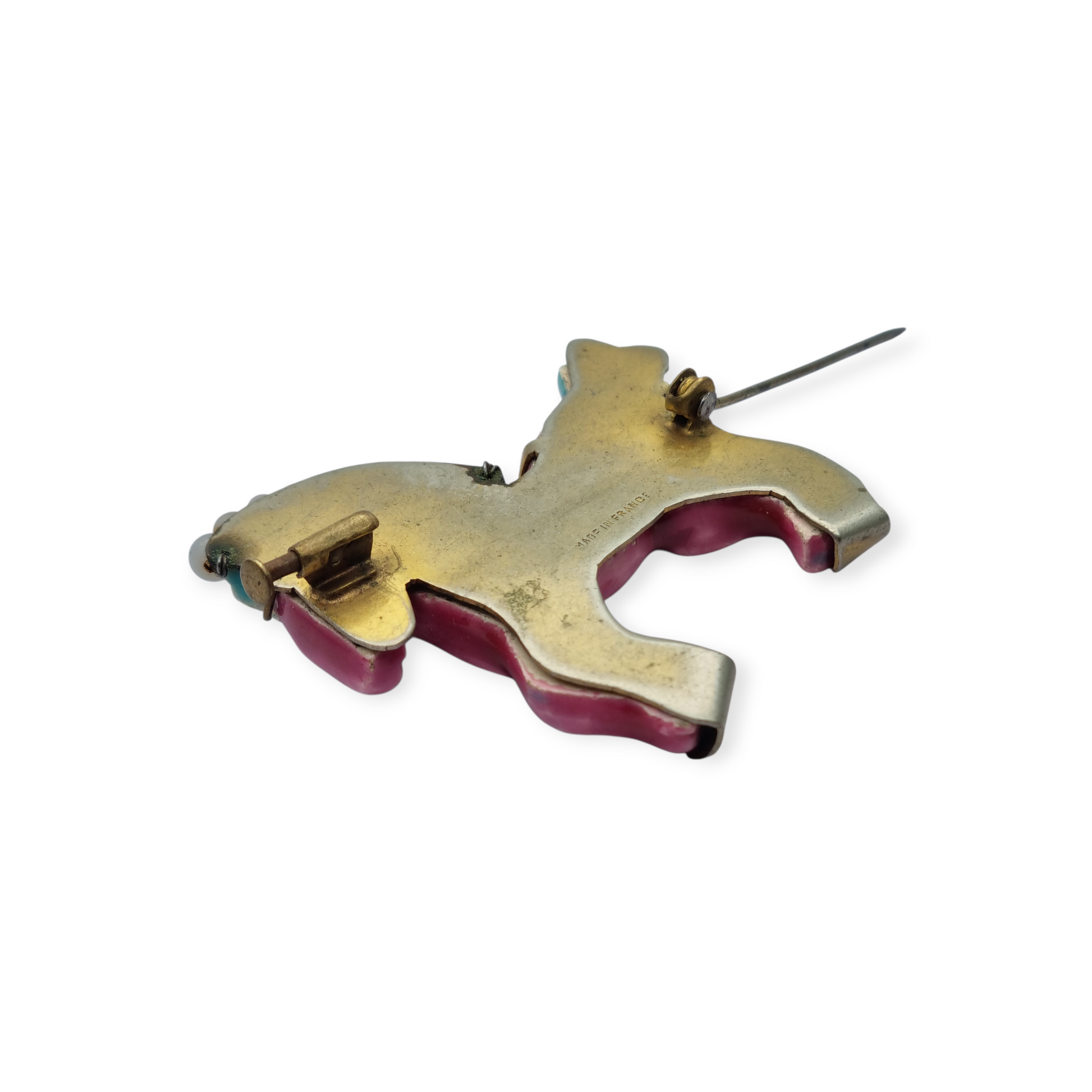 A representative piece of mid-20th-century French jewelry, featuring a playful and decorative zoomorphic design. It has polychrome enamel in shades of pink and blue, decorative beads in the mane, and a blue crystal set as an eye. The metal reverse bears the inscription βMADE IN FRANCE,β confirming its origin. An attractive example of the colorful and expressive taste of the period.