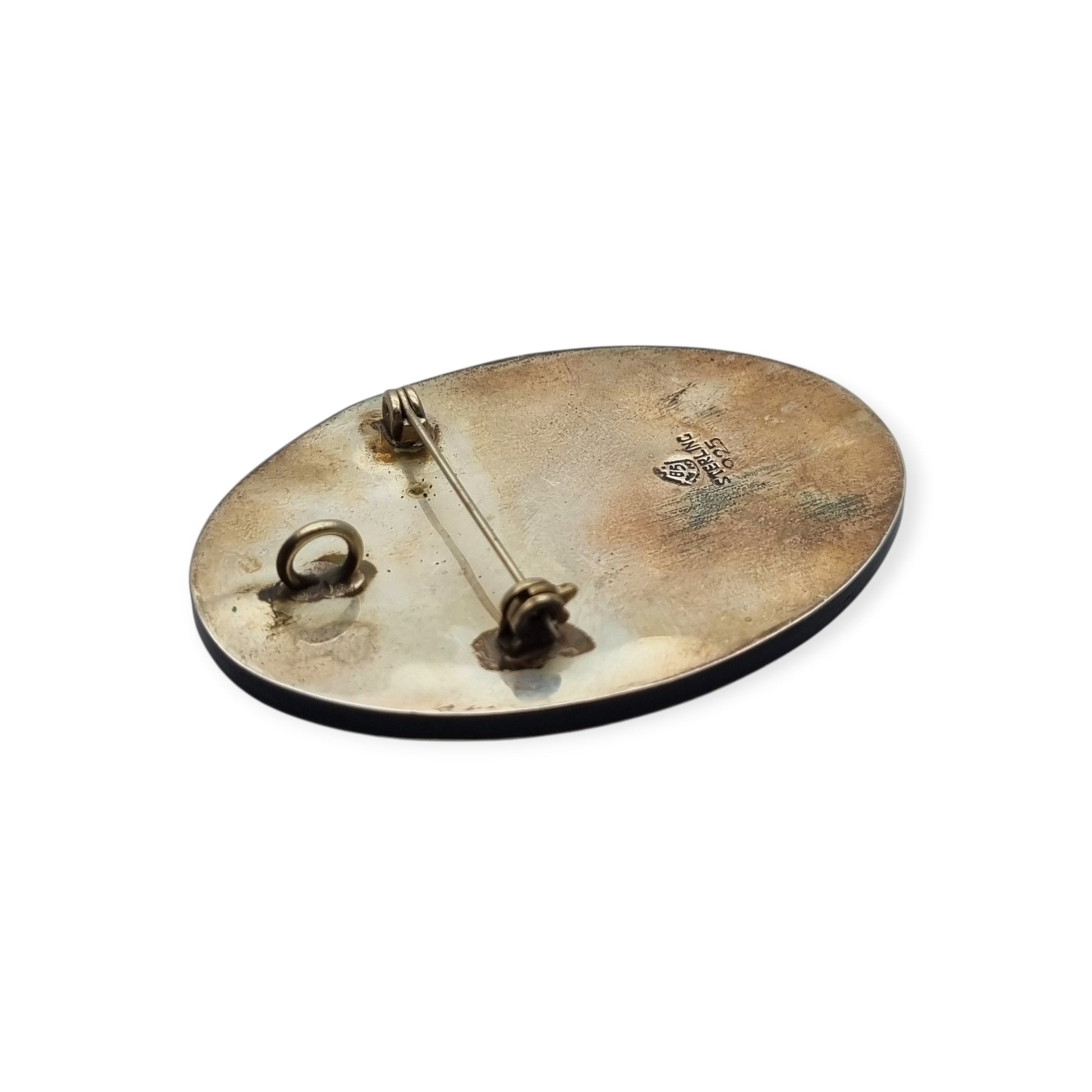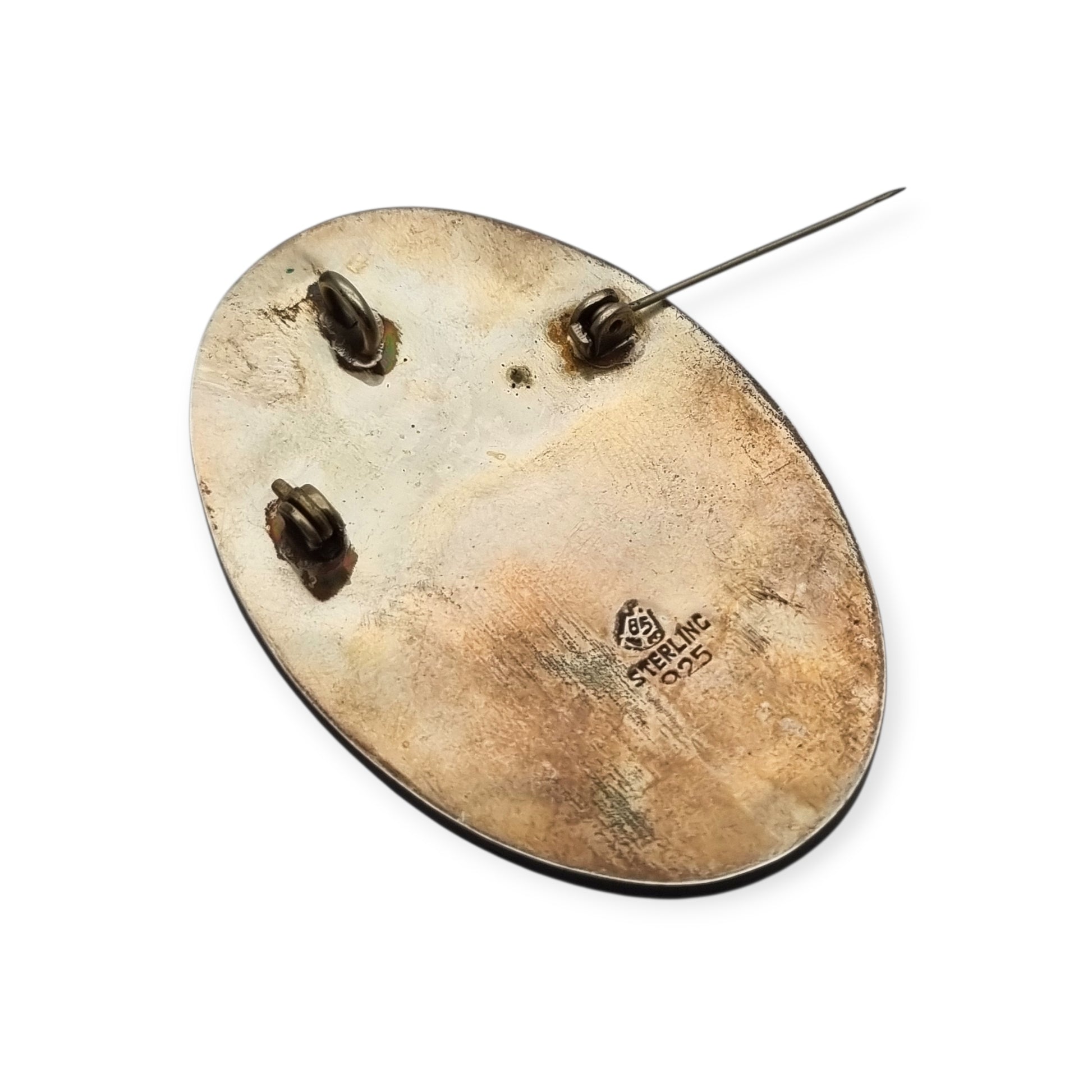 Vintage Mexican sterling silver brooch and pendant inlaid with black enamel and brass, depicting an Aztec warrior in a figural style. Signed on the reverse with the eagle 58, attributed to Antonio Pineda, Los Castillos, circa 1960-70.