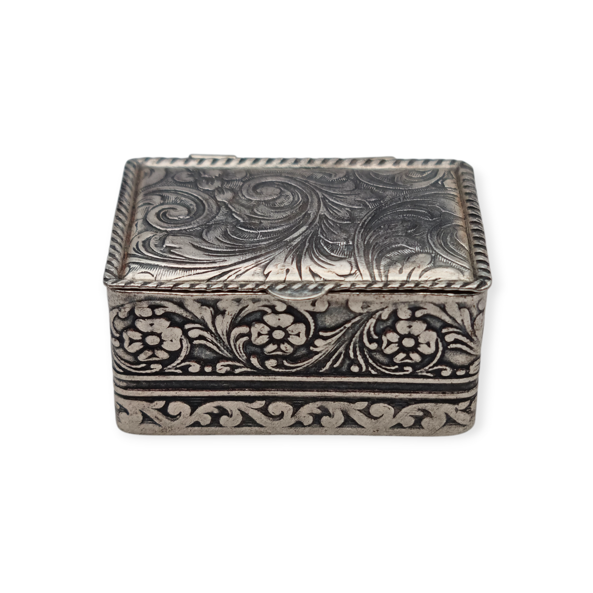 Elegant small silver box with richly engraved vegetal decoration on the lid and sides. The lid features ornamental work on both sides, with highly detailed floral motifs and scrolls, framed by a fine braided border.