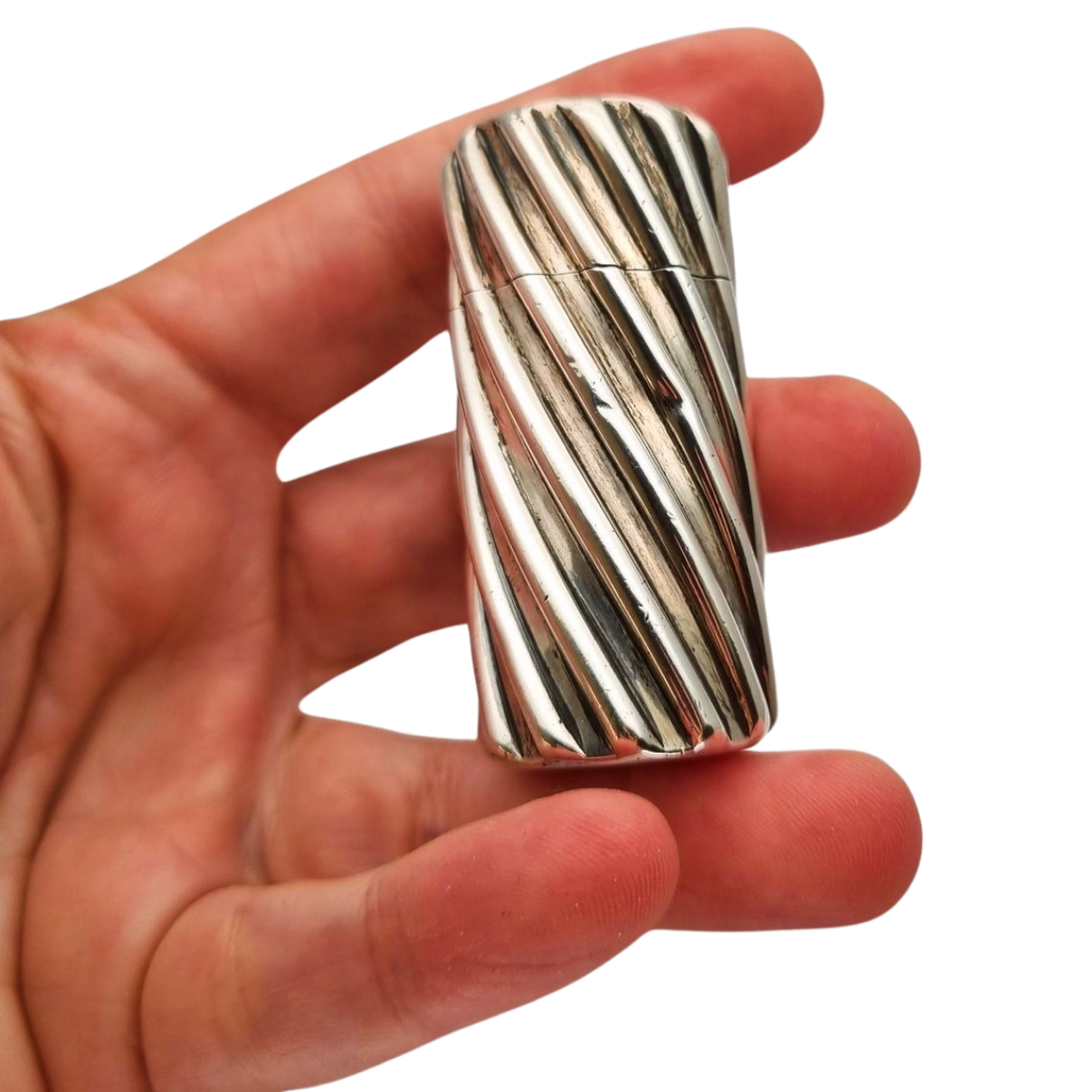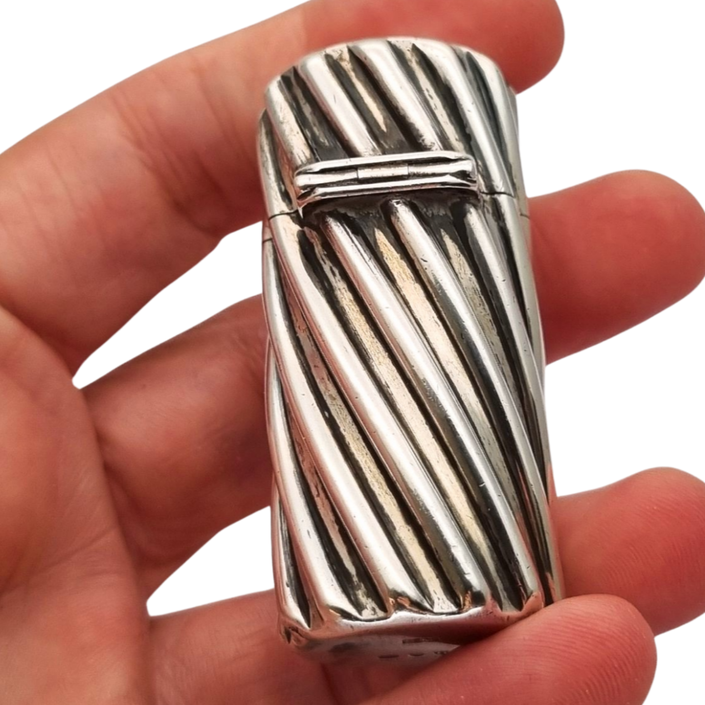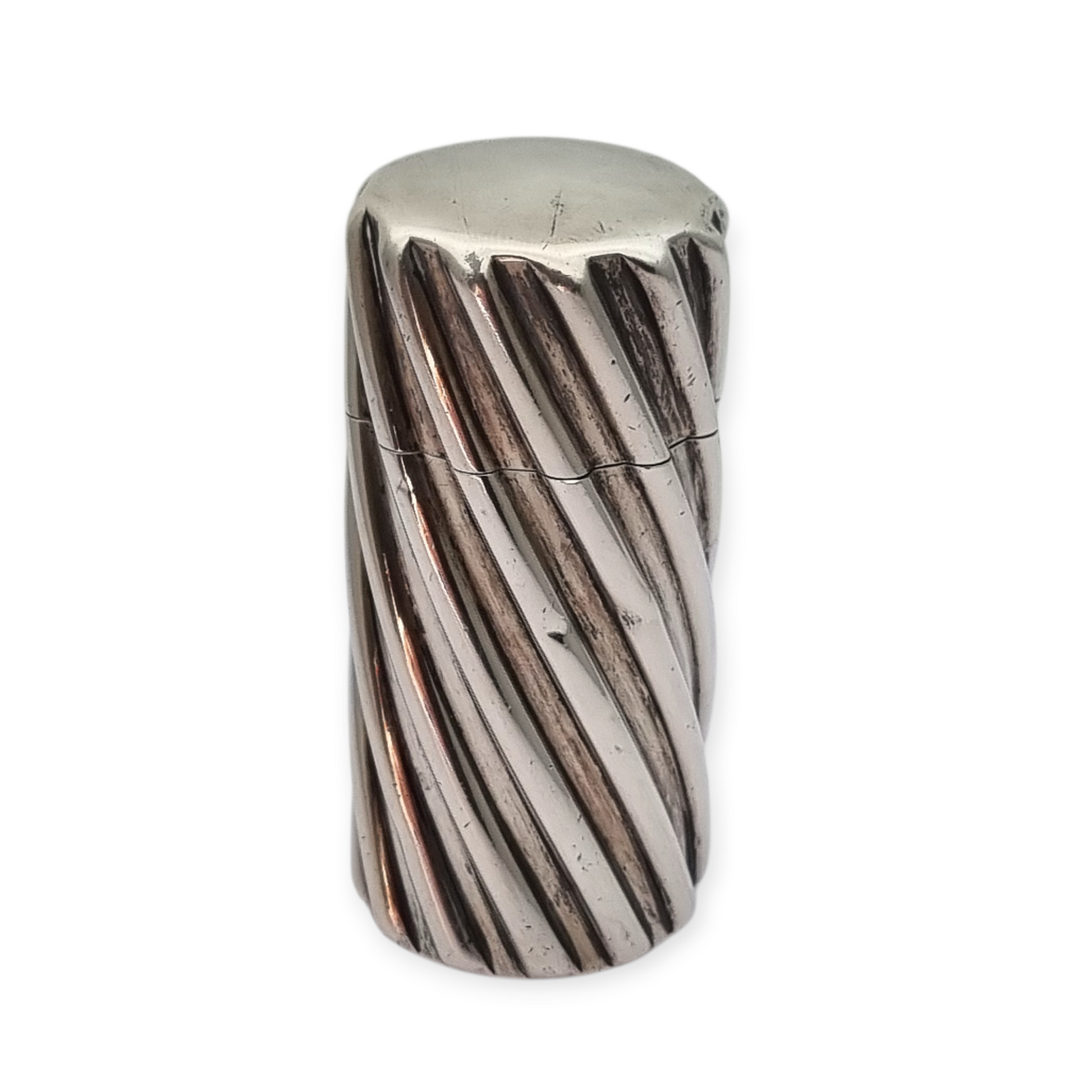 Victorian silver perfume bottle with fluted design, signed by S.M, Sampson Mordan & Co, London, dated 1882. Cylindrical shape with hinged lid and embossed diagonal lines.