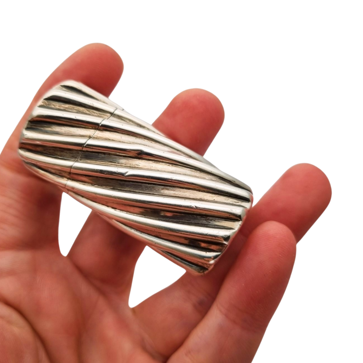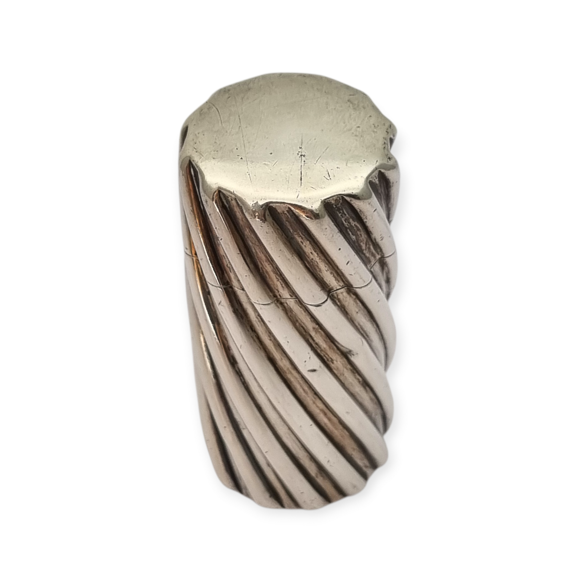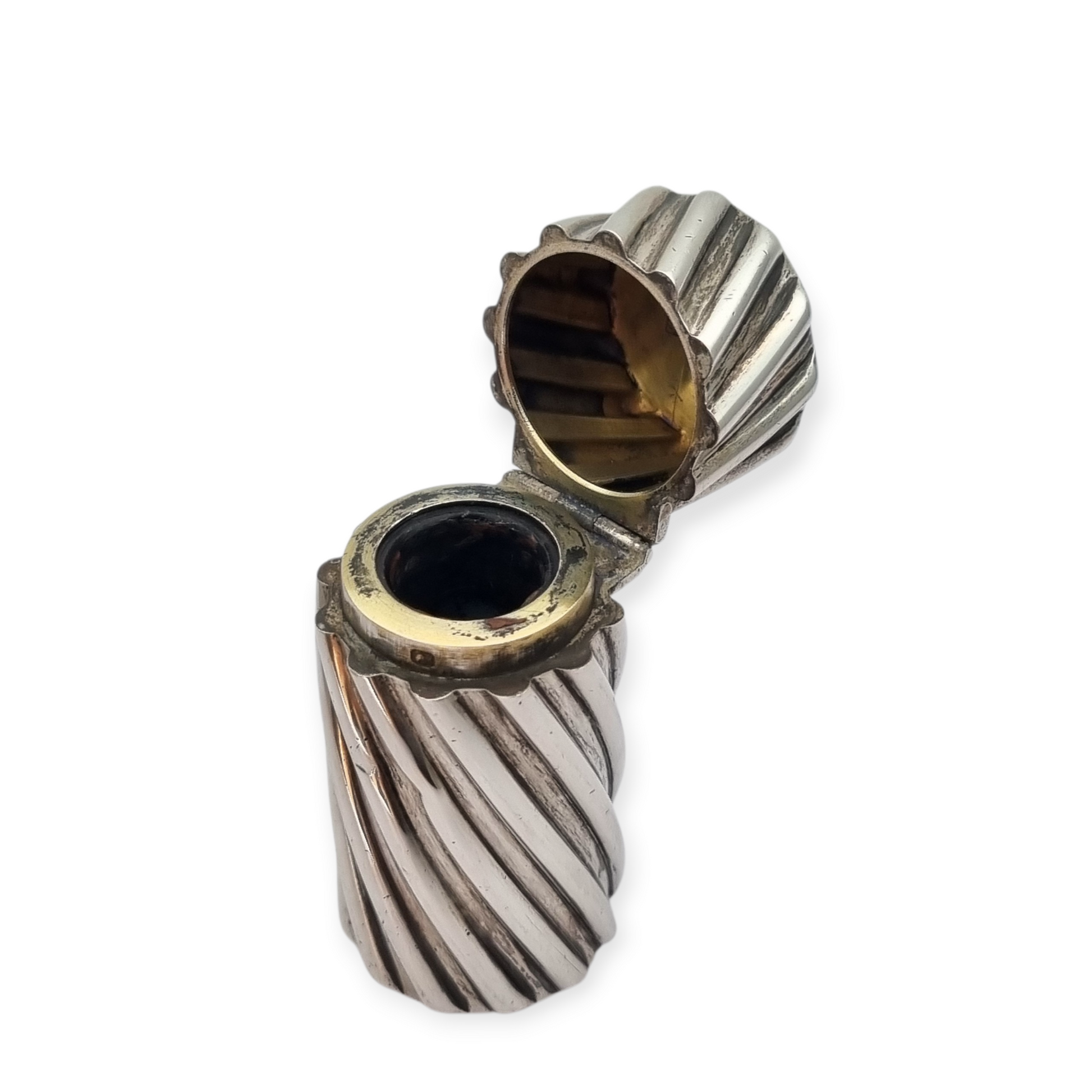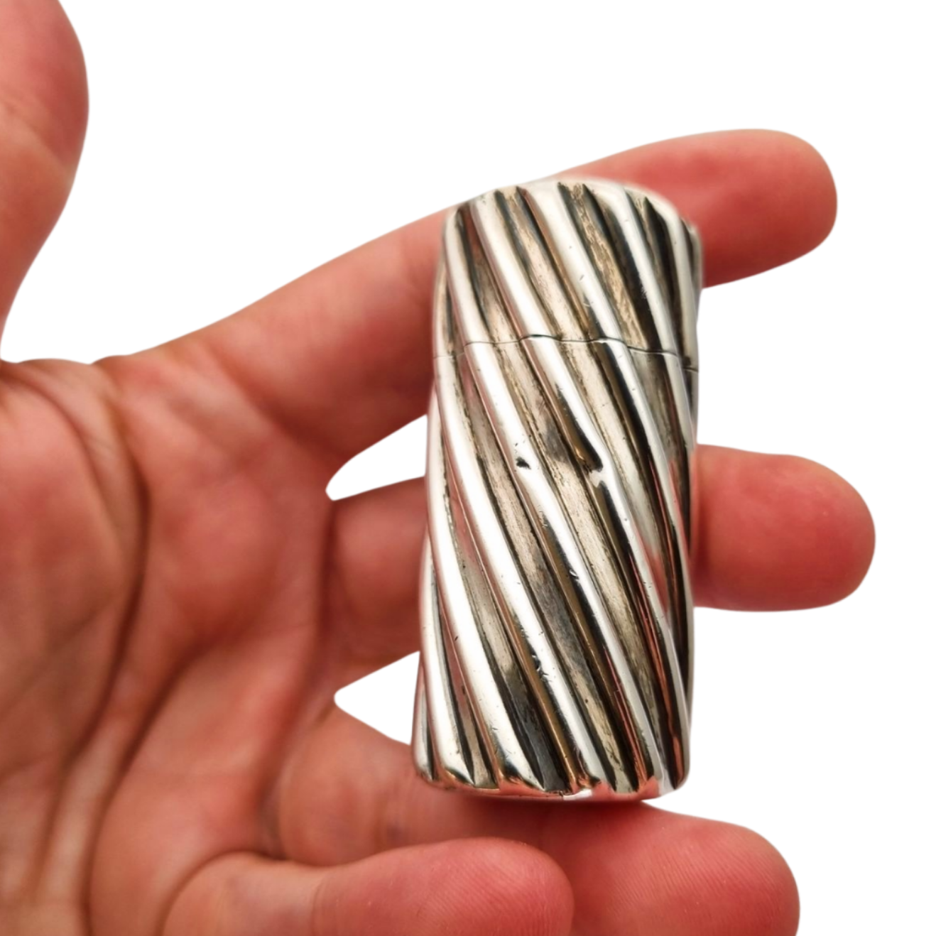 Victorian silver perfume bottle with fluted design, signed by S.M, Sampson Mordan & Co, London, dated 1882. Cylindrical shape with hinged lid and embossed diagonal lines.
