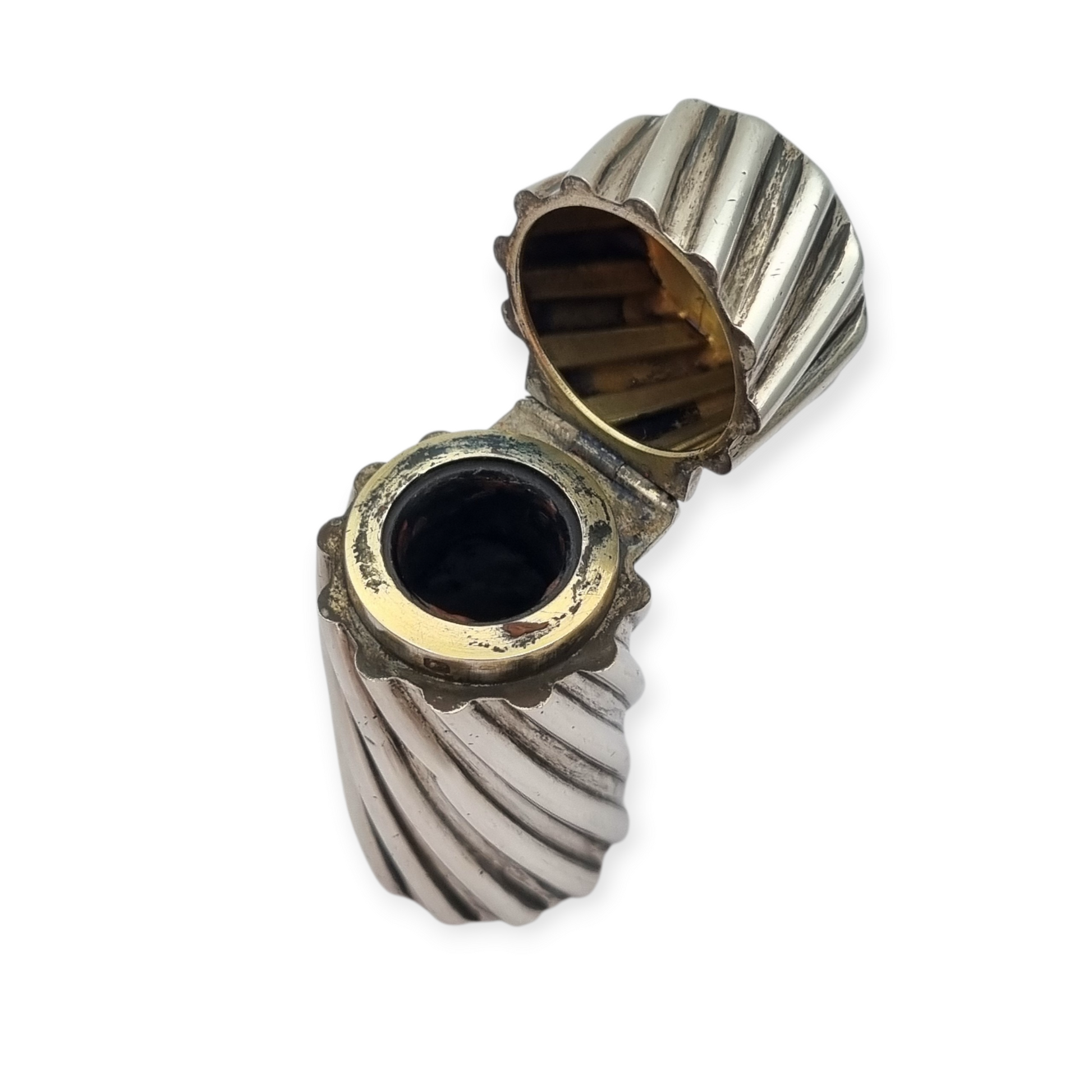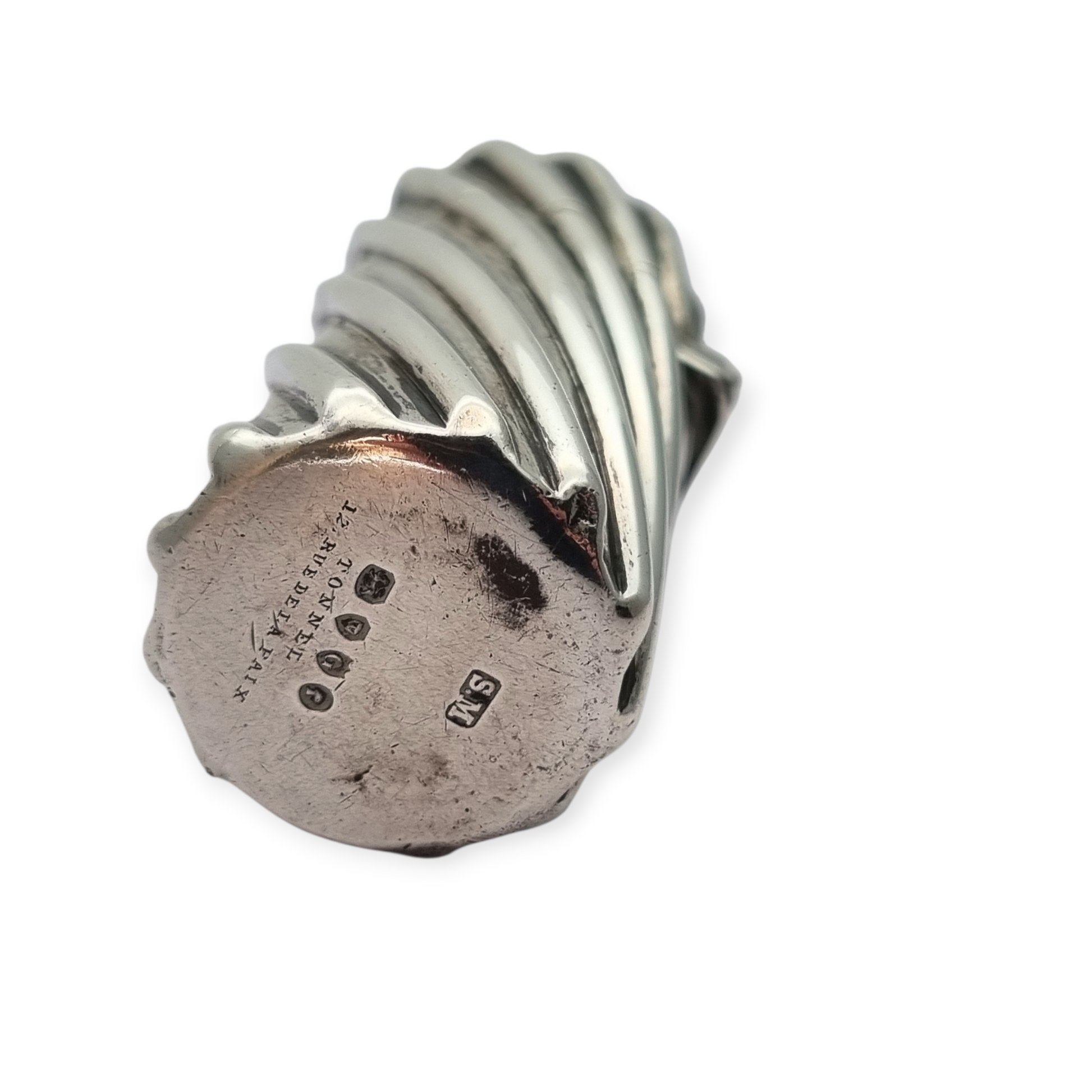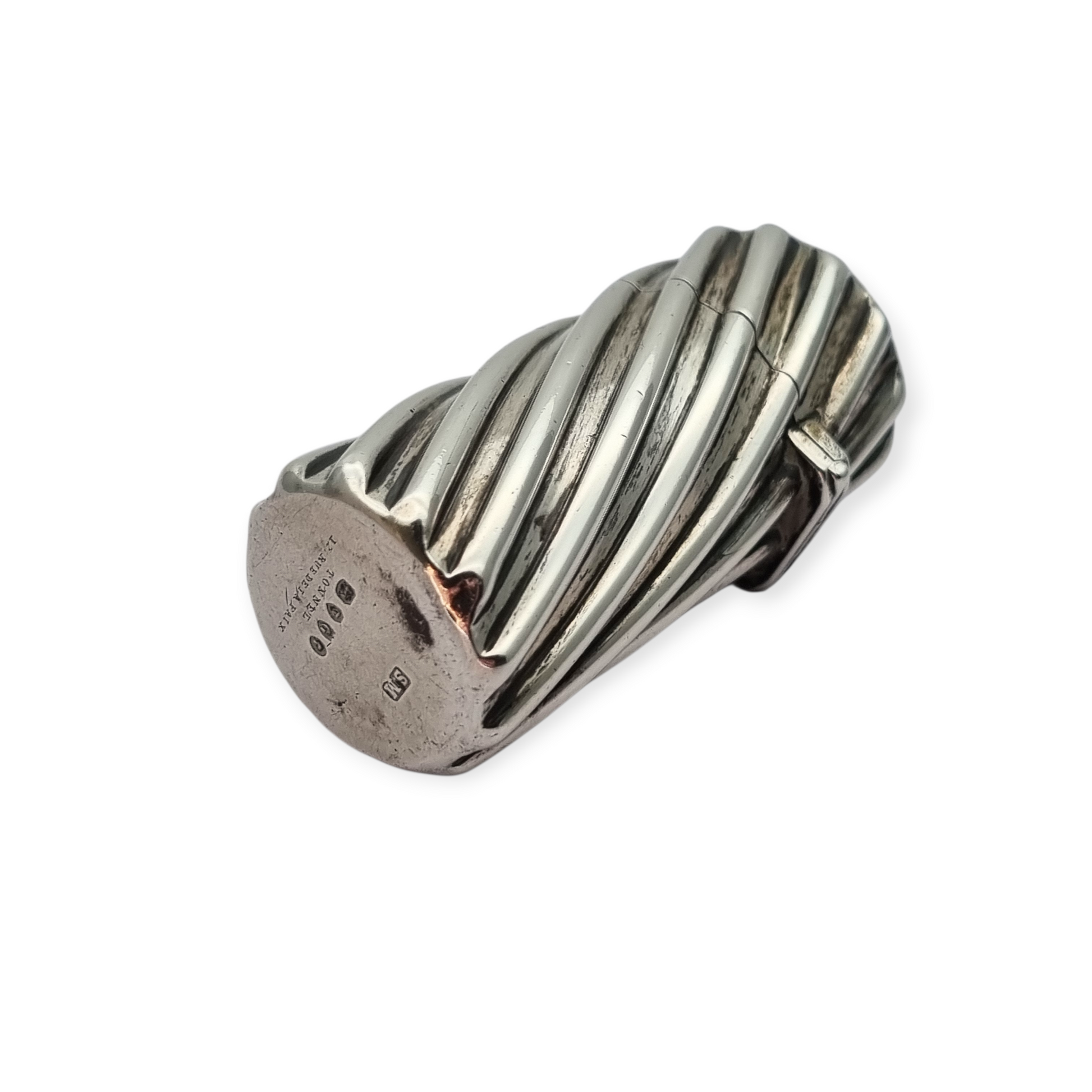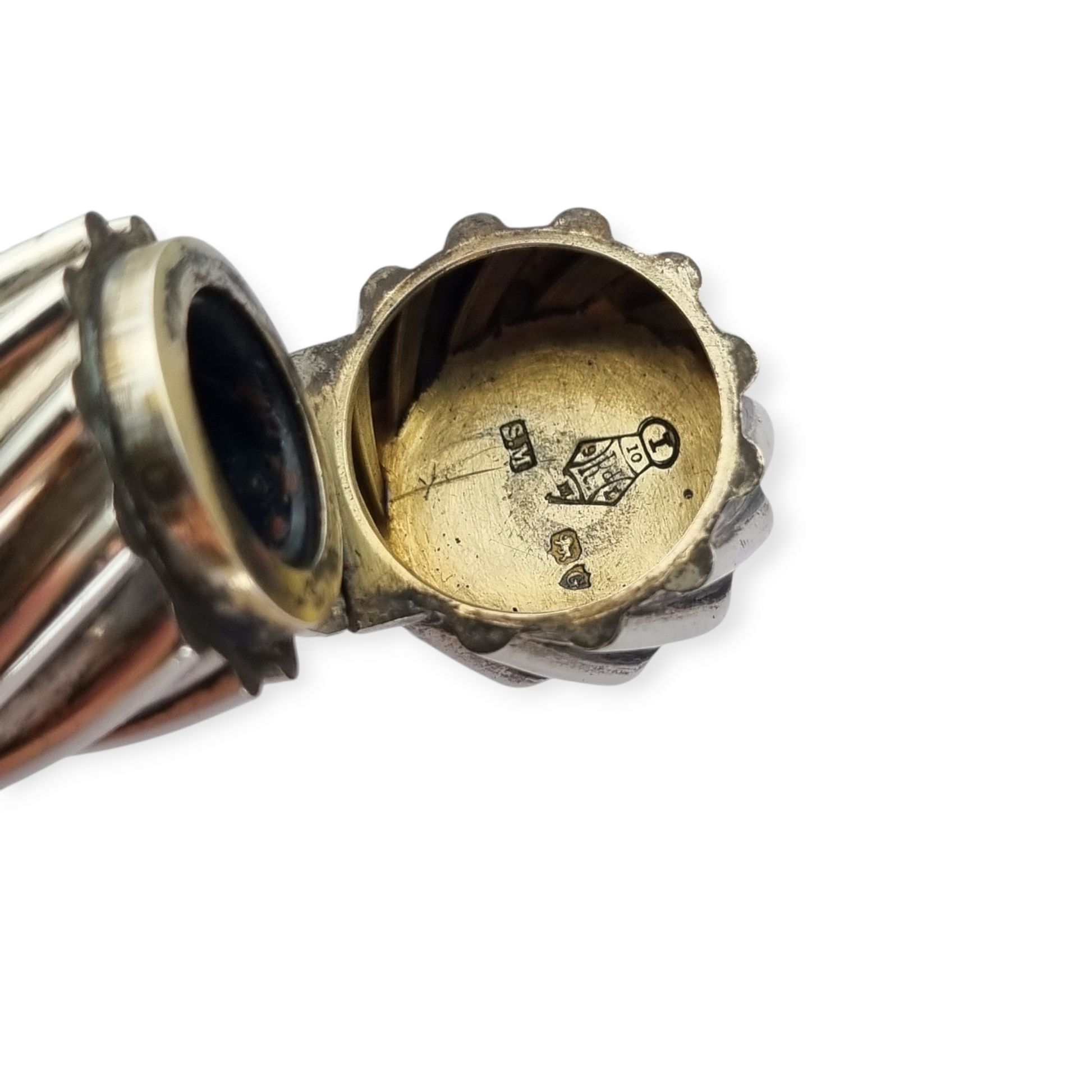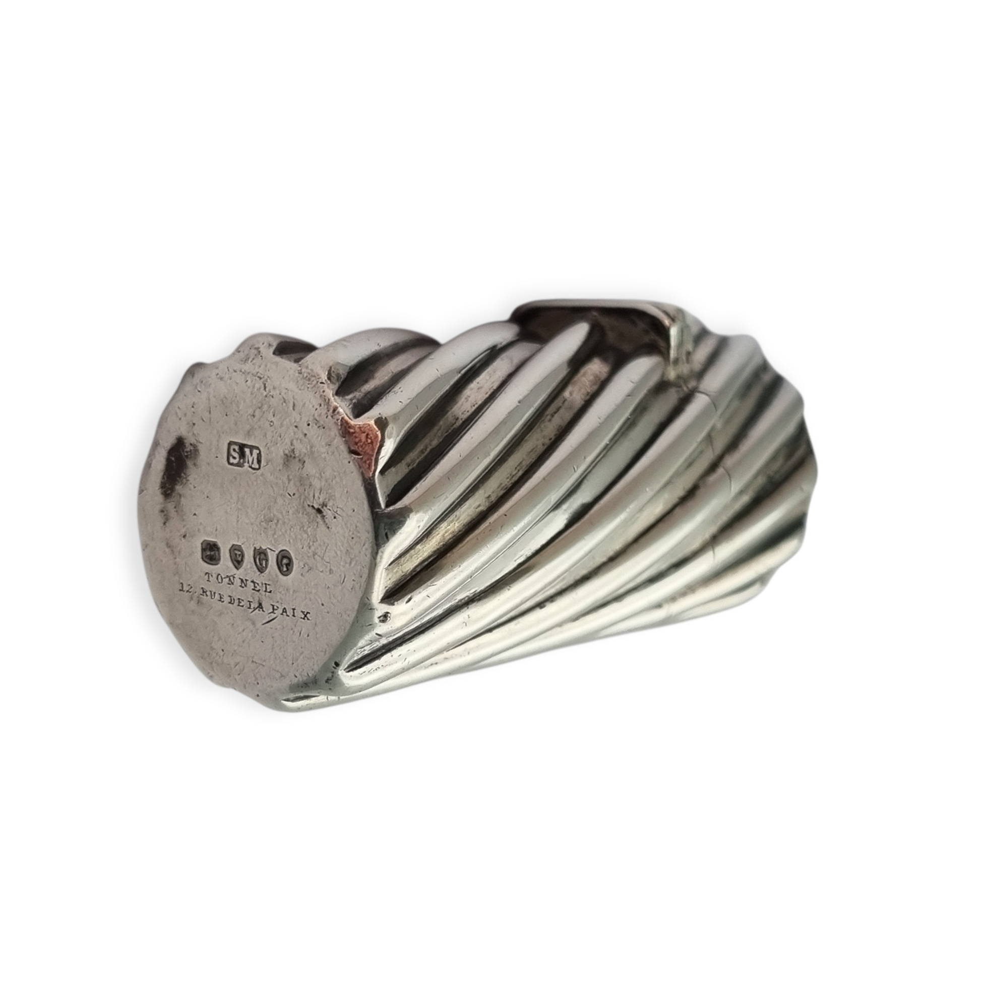 An example by an important English silversmith, Sampson Mordan & Co, founded in 1880. It features full English hallmarks and the mark of the distributor Tonnel, 12 Rue de la Paix, in Paris. Its interior preserves the perfume compartment. A collectible and luxury item, representative of elegance and functionality in the Victorian era.