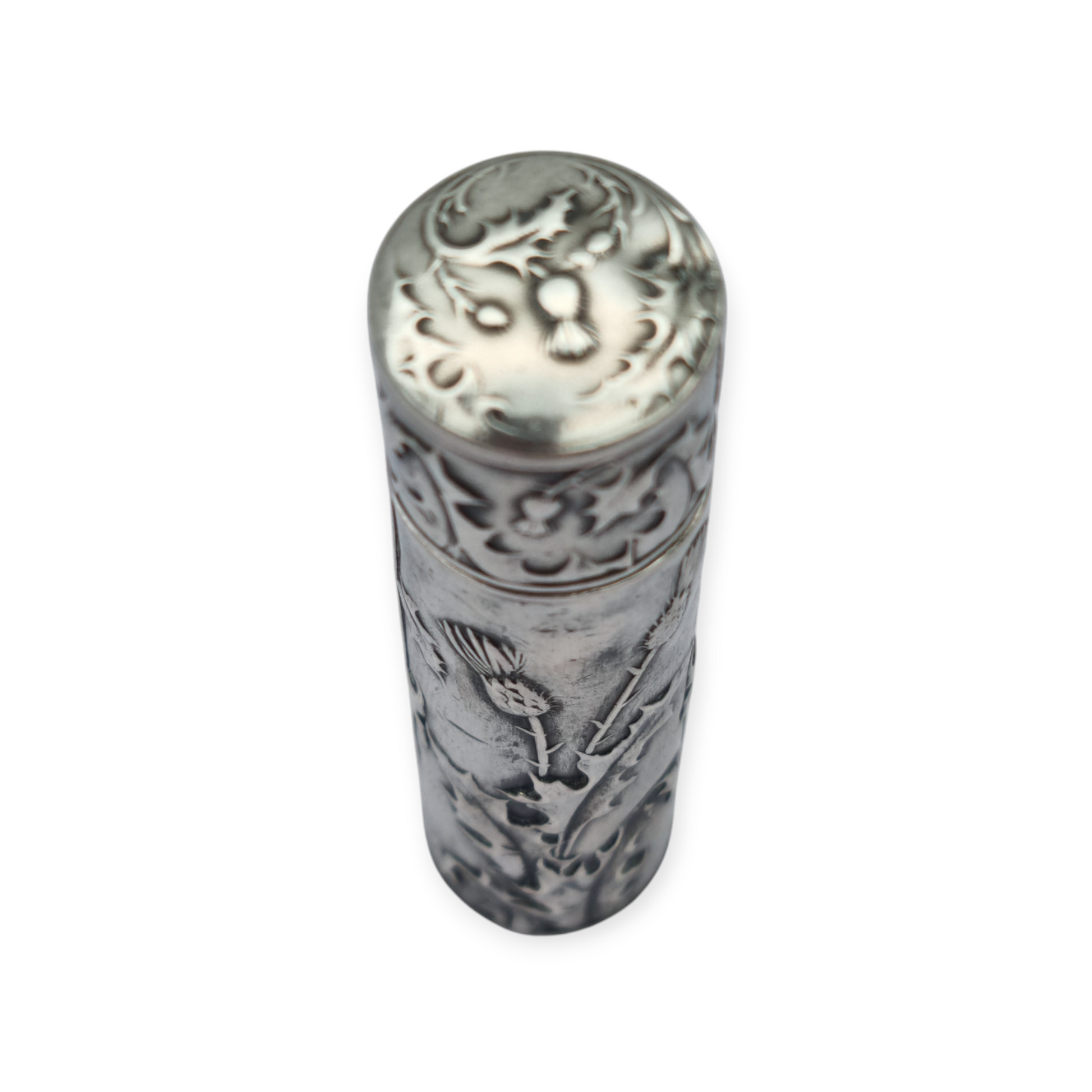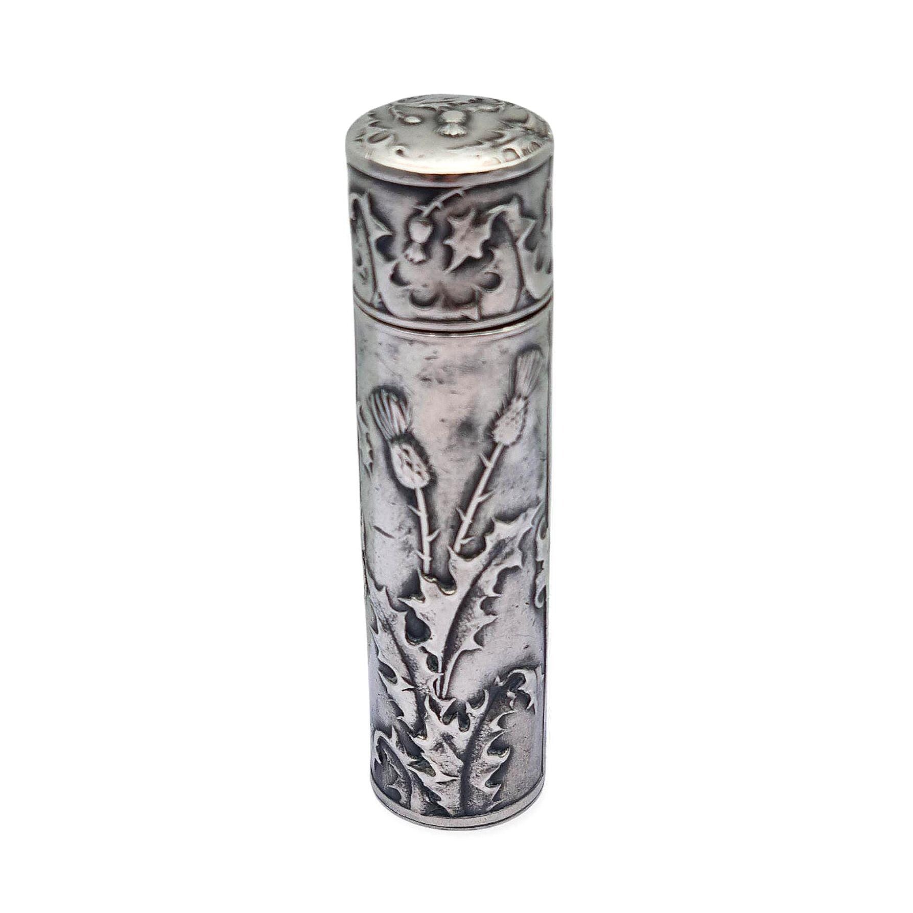 Antique silver chatelaine flask with thistle engraving, Art Nouveau style. Cylindrical container for ointment or solid perfume.