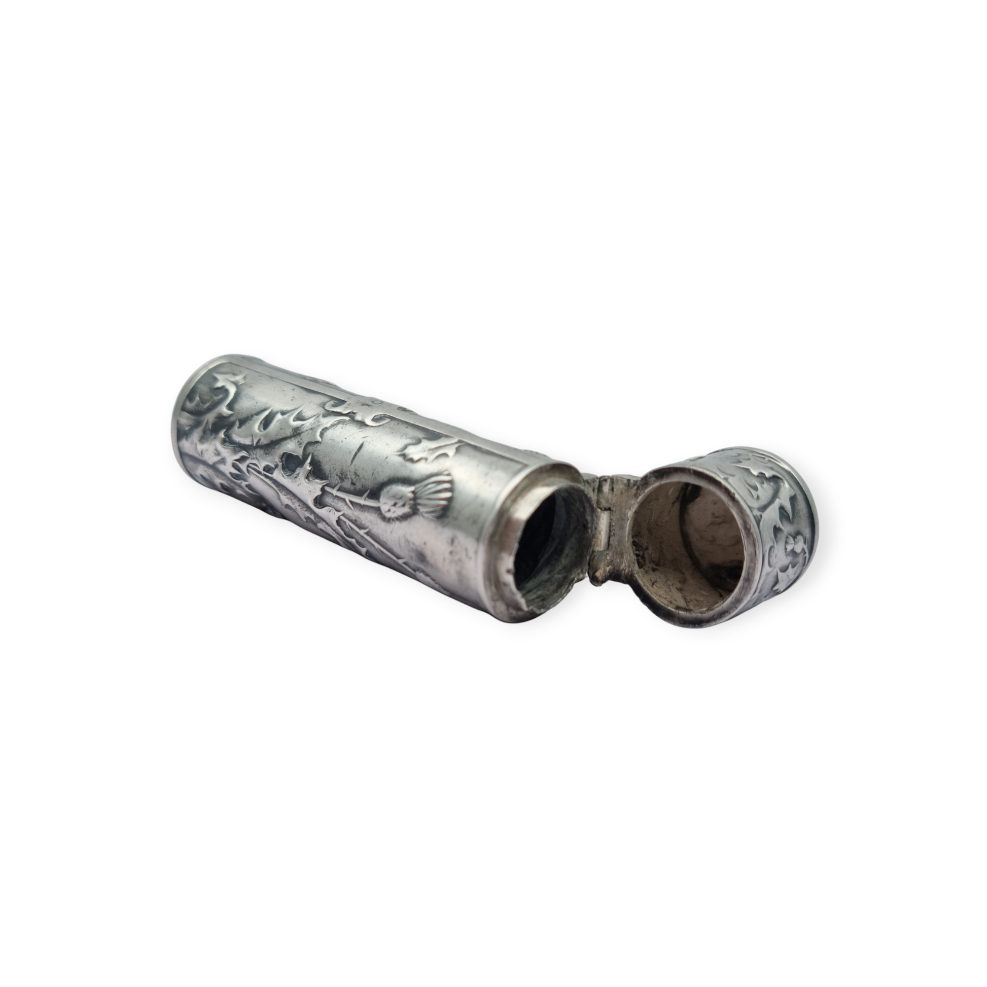 These small bottles were used in the 19th century as part of chatelaine sets, hanging from the waist to carry ointments, balms, or perfumes. The thistle, a symbol of protection, was frequently incorporated into Art Nouveau ornamental design. Their cylindrical shape and hinged lid reveal the careful craftsmanship typical of women's toiletries of the period.