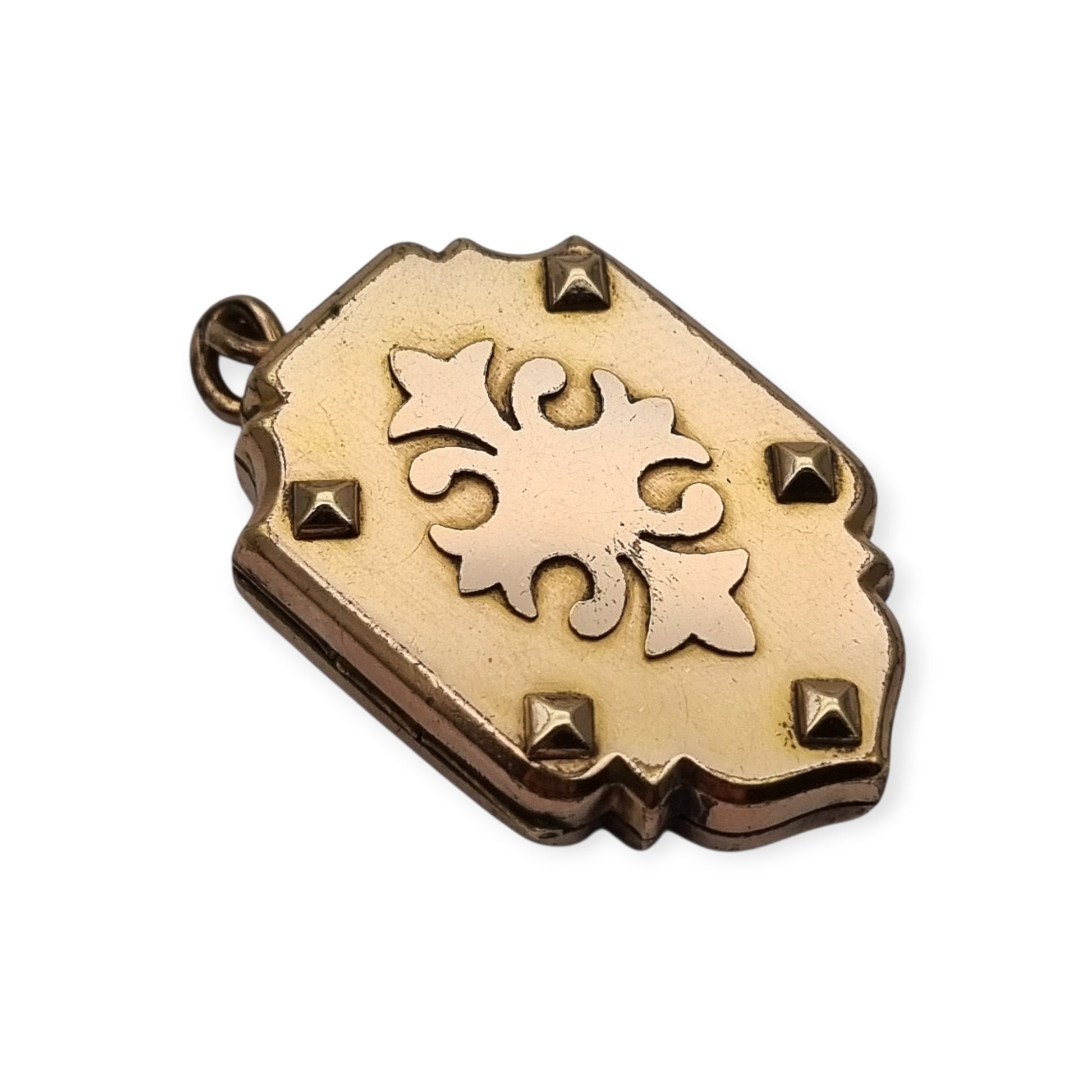 Antique locket in gilt metal with engraved shield-shaped design, Victorian era, circa 1900. Ideal as a sentimental piece or collector's item.