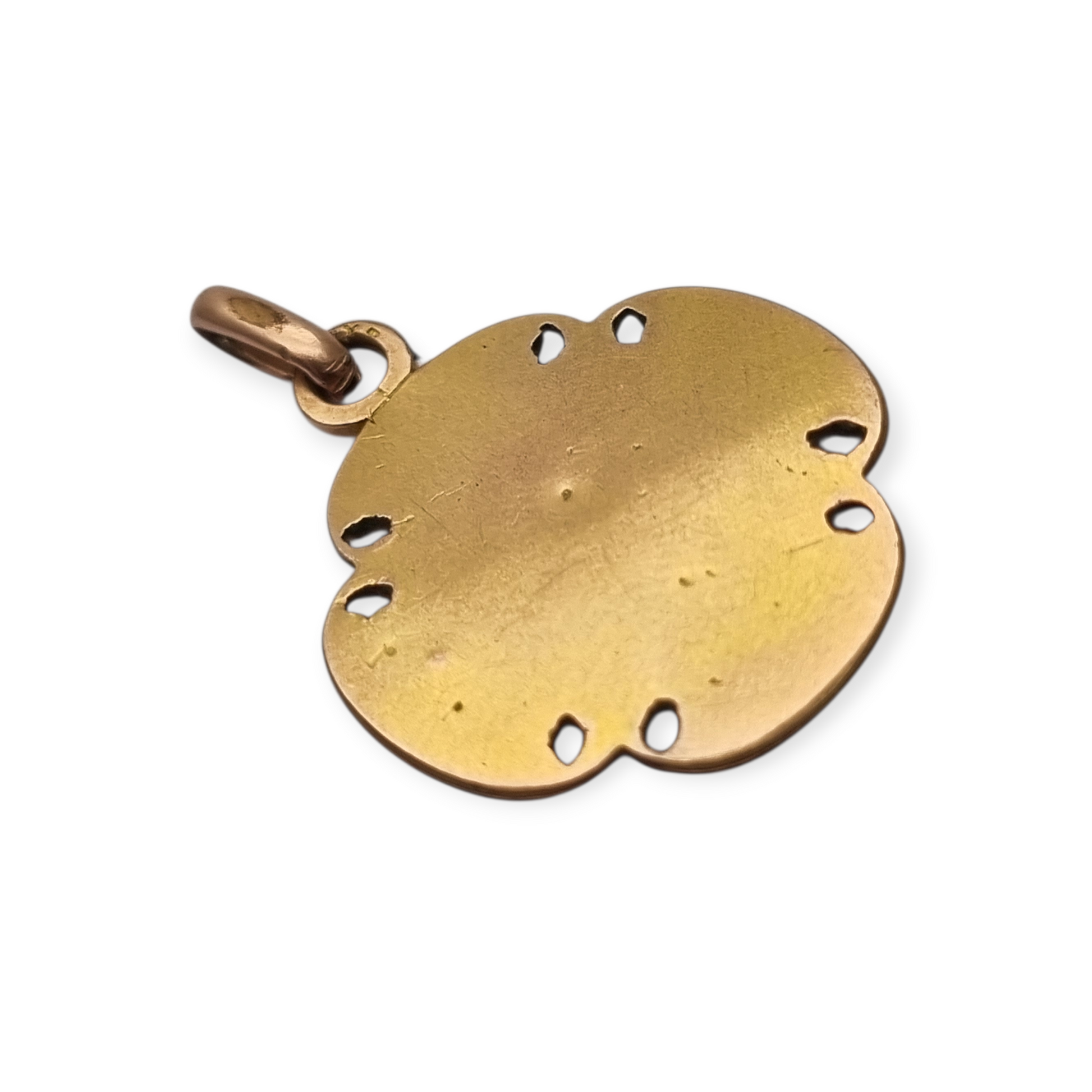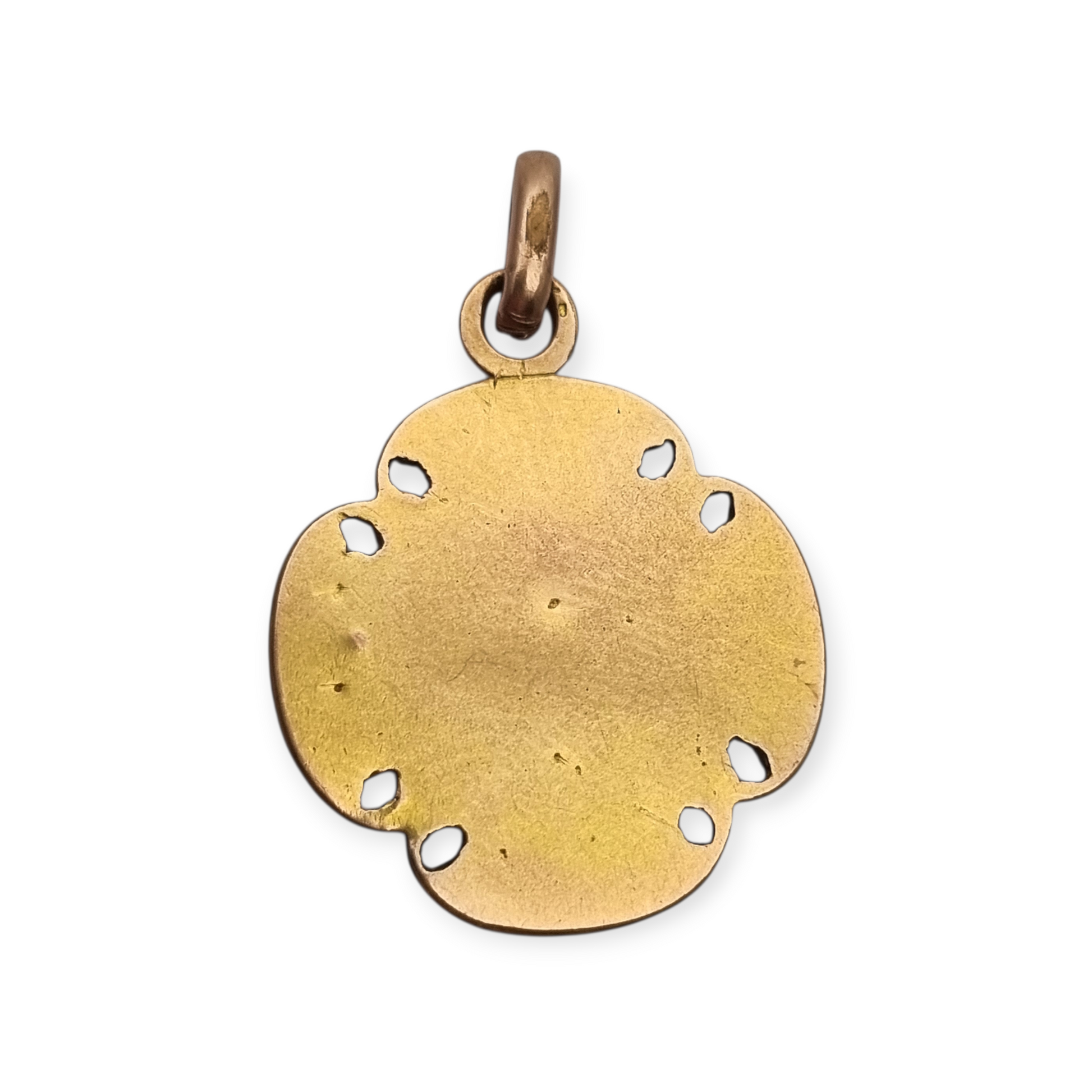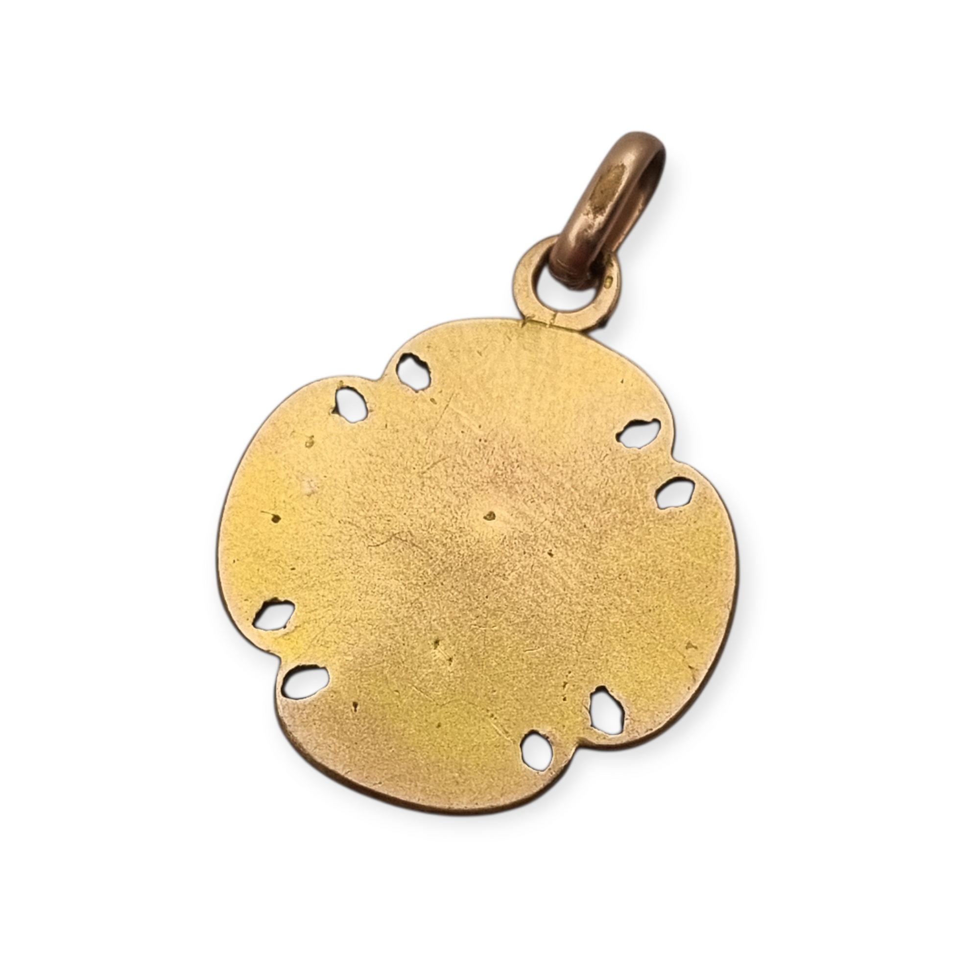 This type of medal was common as a First Communion memento or Eucharistic symbol. The chalice with the host represents the sacrament and is framed by a quatrefoil cross, a symbol of spiritual protection. The decorative perforations and embossed details recall the ornamental influence of Art Nouveau, which was still prevalent in France in the 1920s. Its shape also evokes the trefoil, associated with the Holy Trinity.