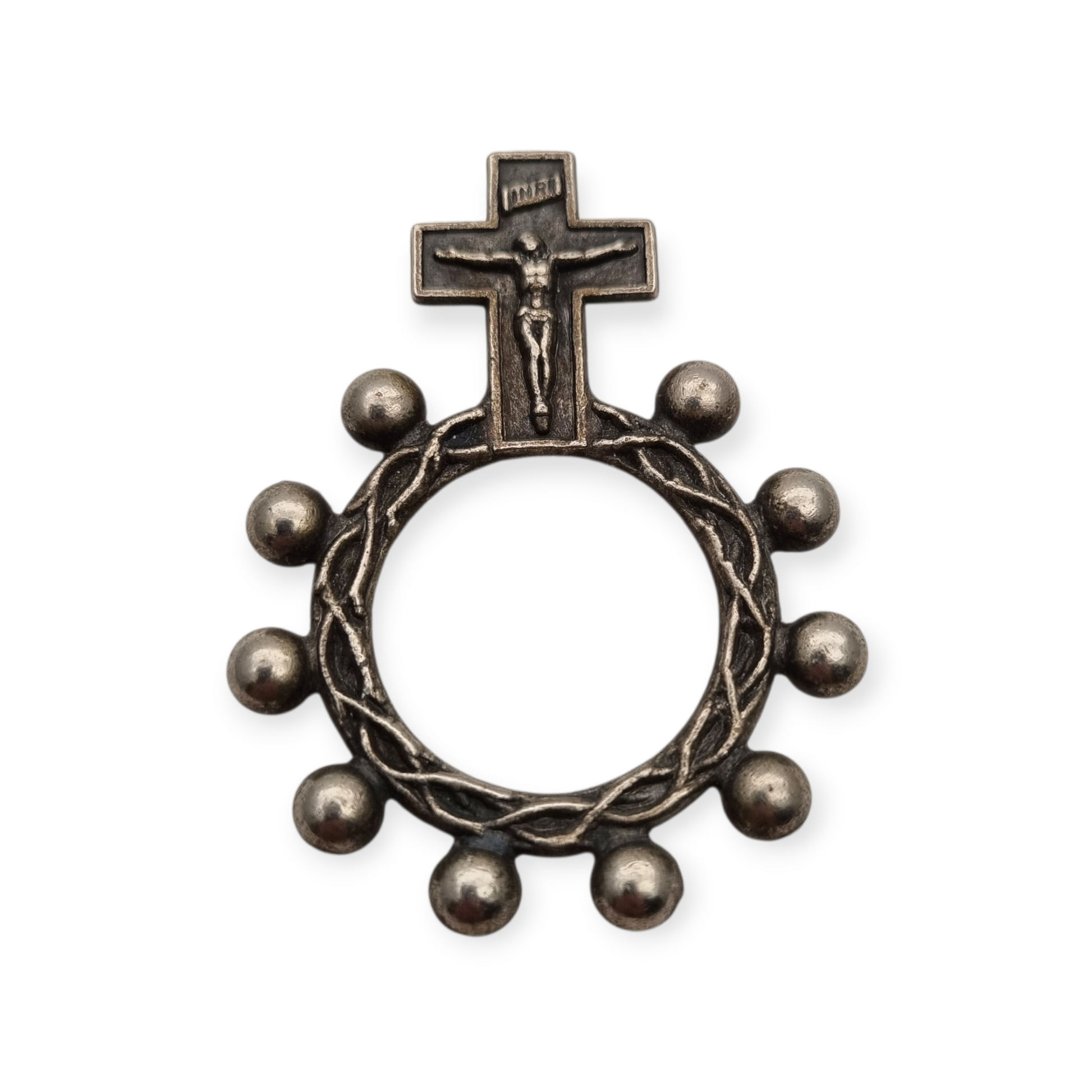 This finger rosary features a compact design with a ring decorated with small spheres and a crown of thorns motif. At the top it incorporates a crucifix with the inscription INRI. These pieces were used as portable devotional objects, allowing the rosary to be prayed in a practical and discreet way in mid-20th century Spain. It can be used as a pendant.